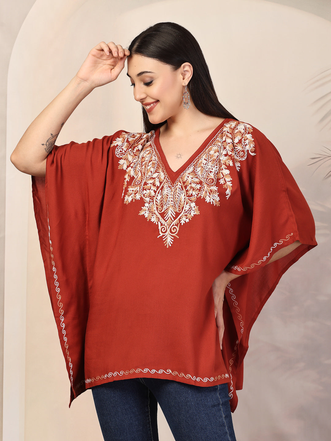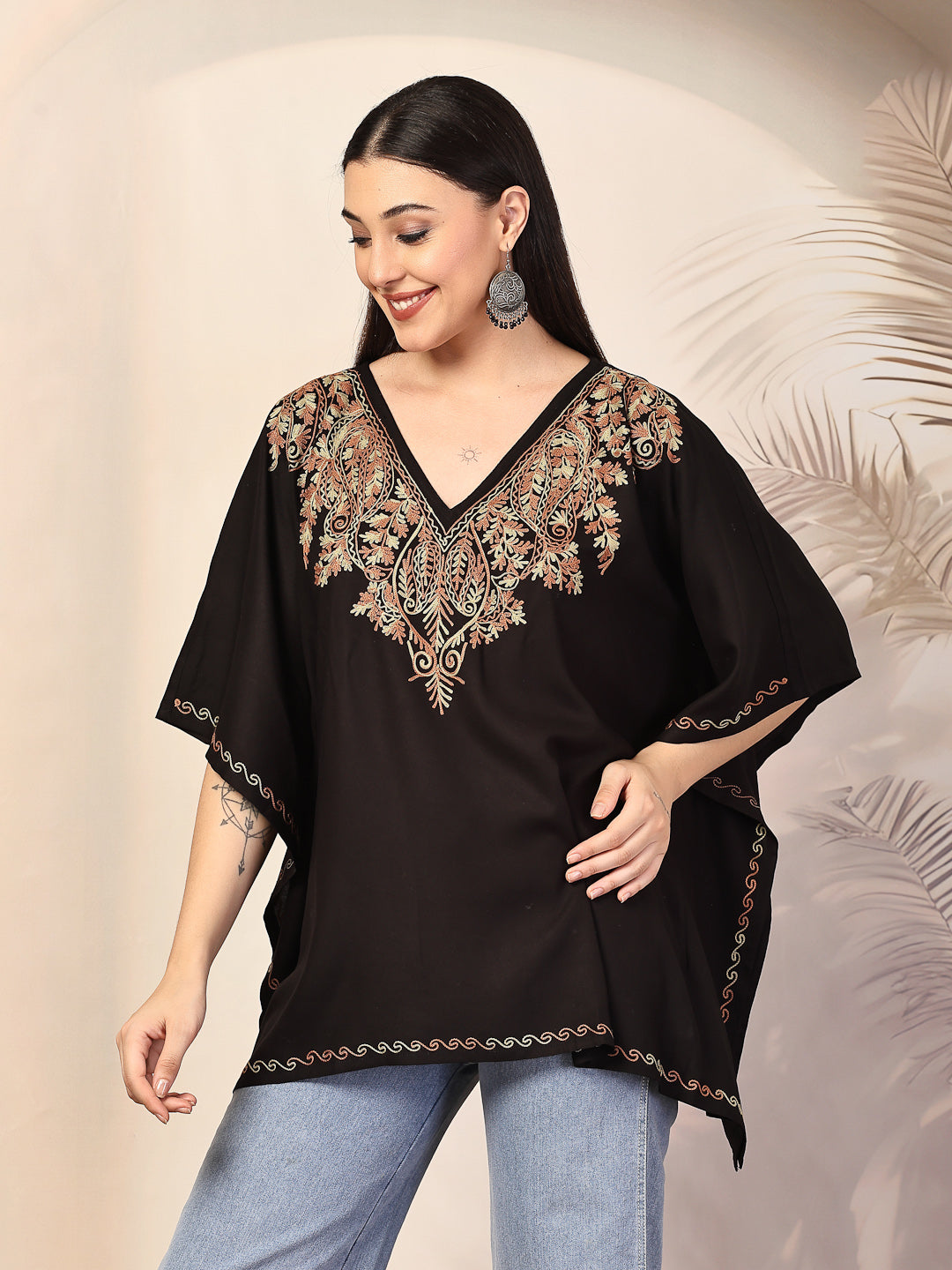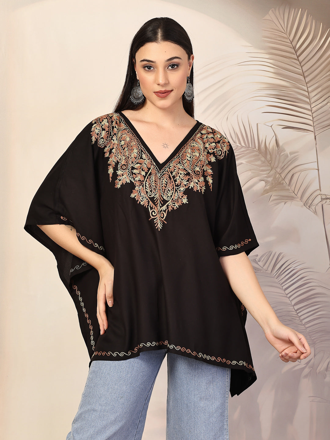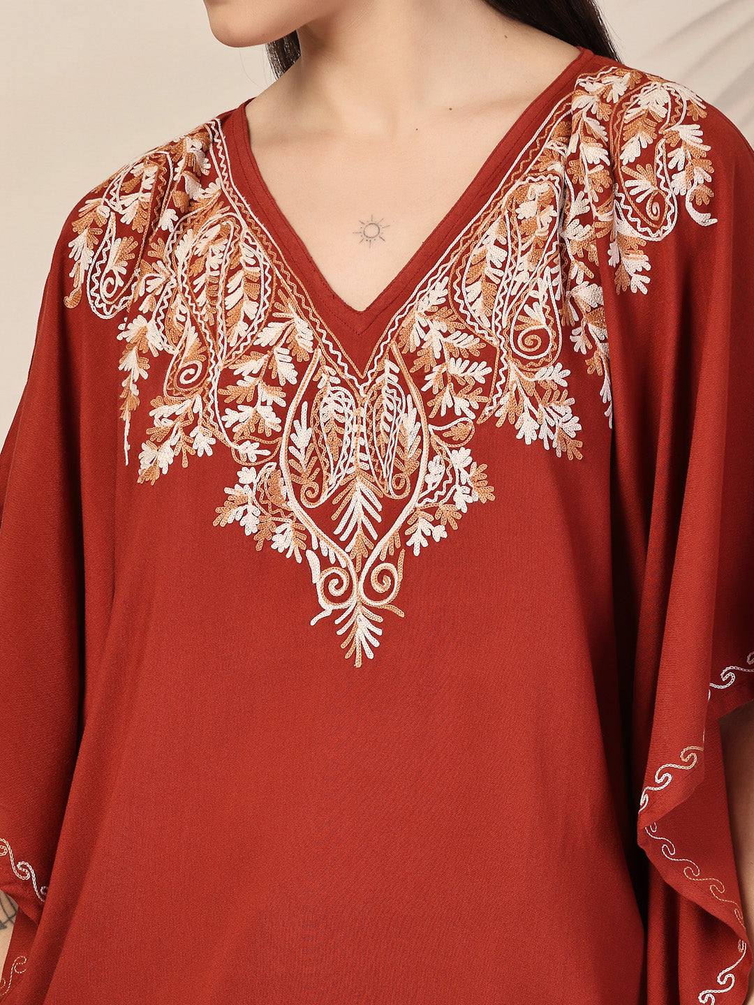 Embrace timeless elegance with our stunning Kashmiri Embroidered Kaftan, a perfect blend of tradition and contemporary style. This free-size kaftan is designed to flatter all body types, offering a comfortable yet stylish fit for every occasion.Crafted from luxurious, breathable fabric, the kaftan is adorned with intricate Kashmiri embroidery—a hallmark of exquisite craftsmanship. The hand-embroidered motifs, featuring traditional paisley, floral patterns, and fine needlework, showcase the rich cultural heritage of Kashmir. Delicate threads of vibrant colors bring the intricate designs to life, making this piece a true statement of art.Whether you're lounging at home, attending a casual gathering, or stepping out for a festive occasion, this kaftan provides effortless style with its flowy silhouette and detailed artistry. Pair it with minimal accessories for a chic, ethnic look.