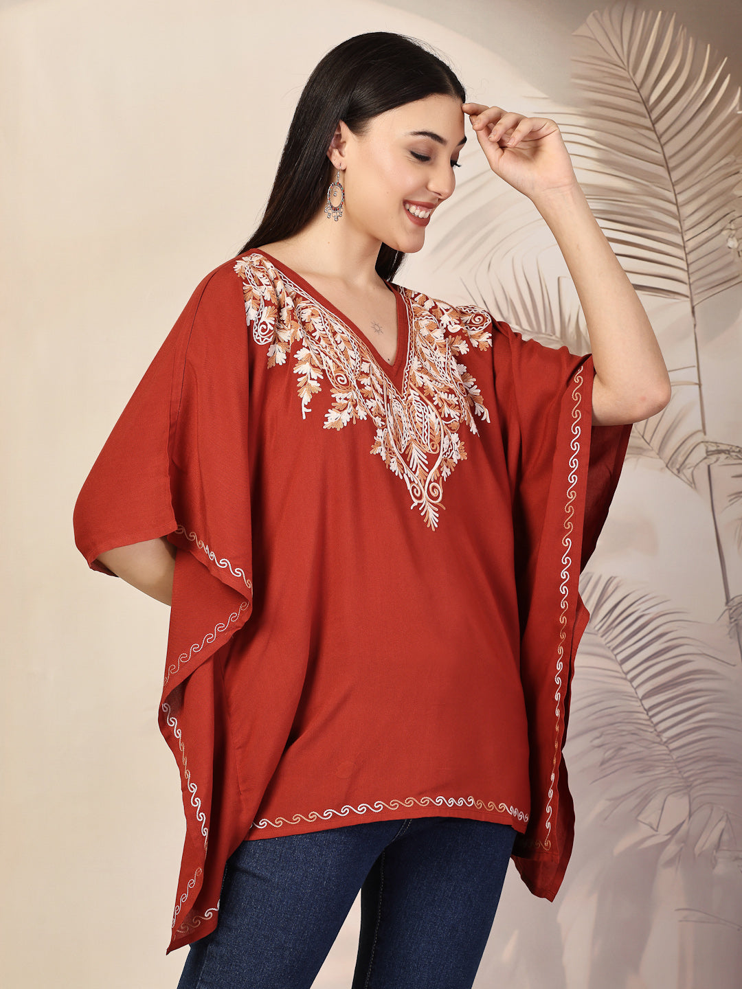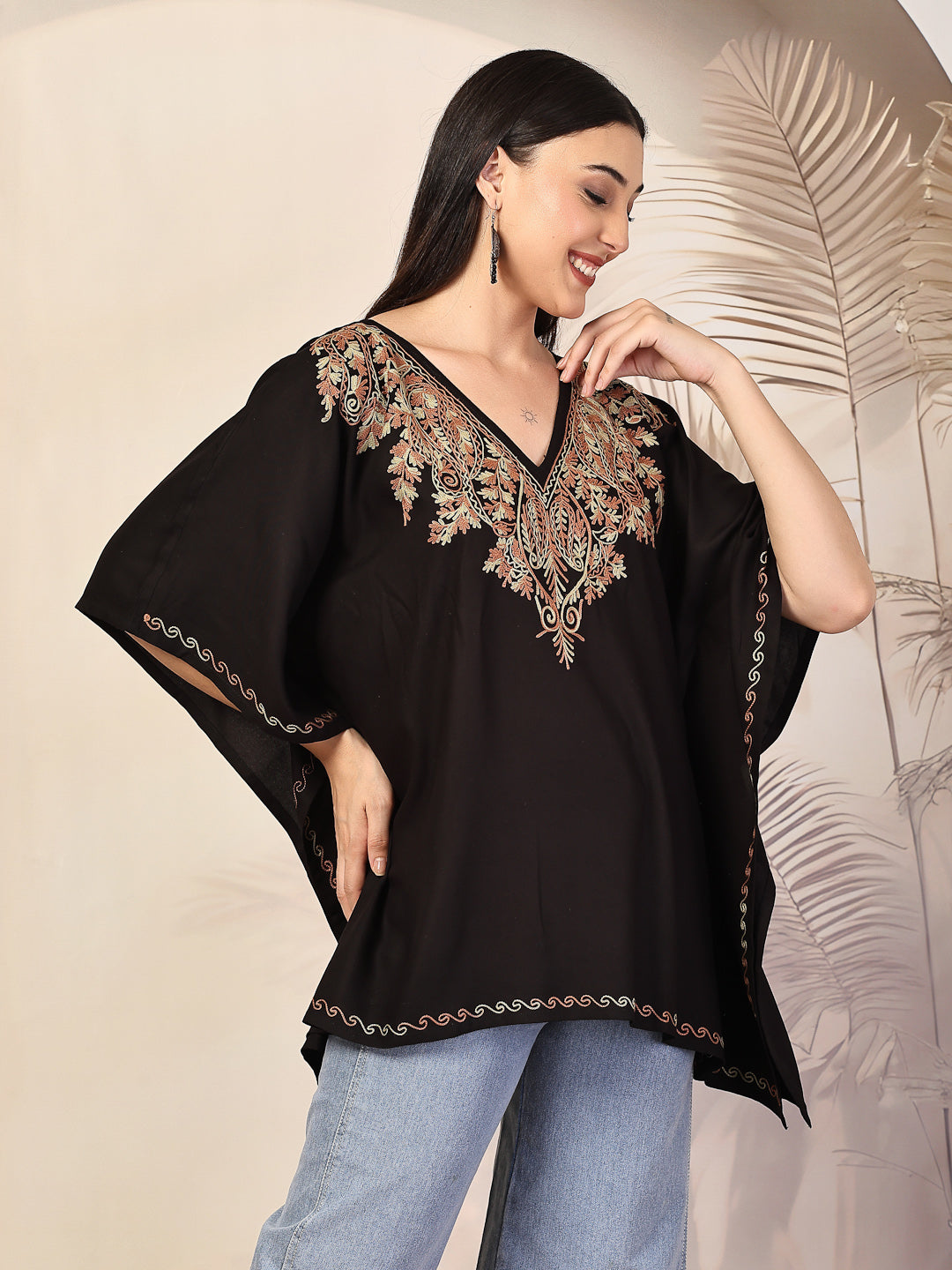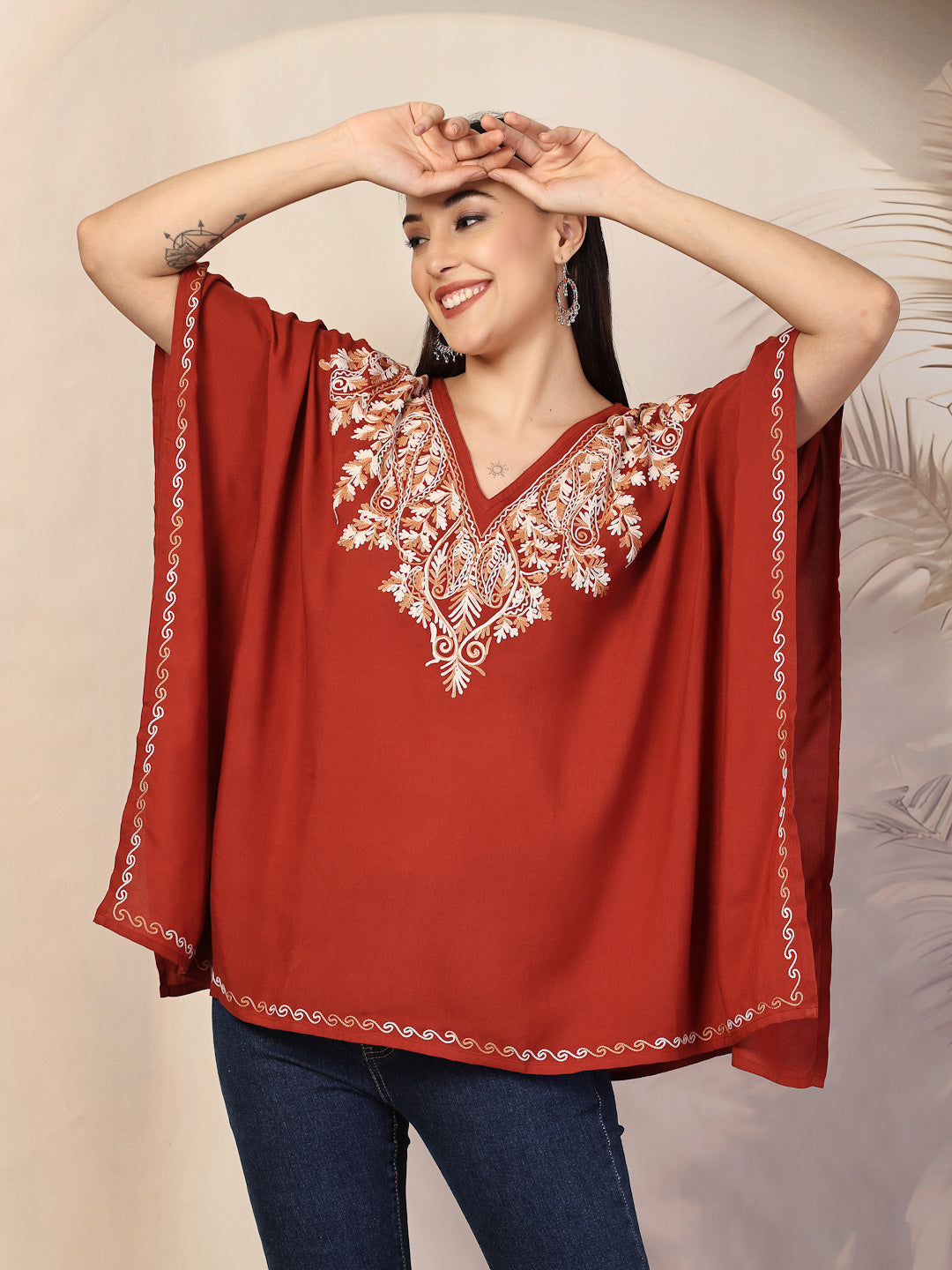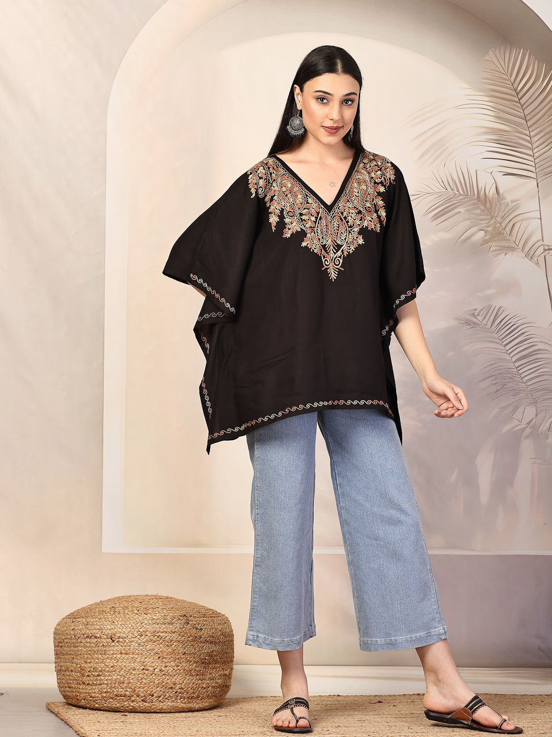 Embrace timeless elegance with our stunning Kashmiri Embroidered Kaftan, a perfect blend of tradition and contemporary style. This free-size kaftan is designed to flatter all body types, offering a comfortable yet stylish fit for every occasion.Crafted from luxurious, breathable fabric, the kaftan is adorned with intricate Kashmiri embroidery—a hallmark of exquisite craftsmanship. The hand-embroidered motifs, featuring traditional paisley, floral patterns, and fine needlework, showcase the rich cultural heritage of Kashmir. Delicate threads of vibrant colors bring the intricate designs to life, making this piece a true statement of art.Whether you're lounging at home, attending a casual gathering, or stepping out for a festive occasion, this kaftan provides effortless style with its flowy silhouette and detailed artistry. Pair it with minimal accessories for a chic, ethnic look.