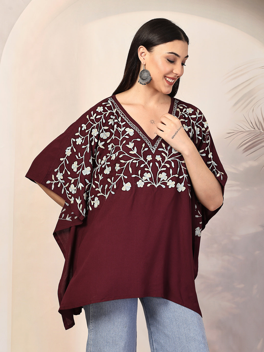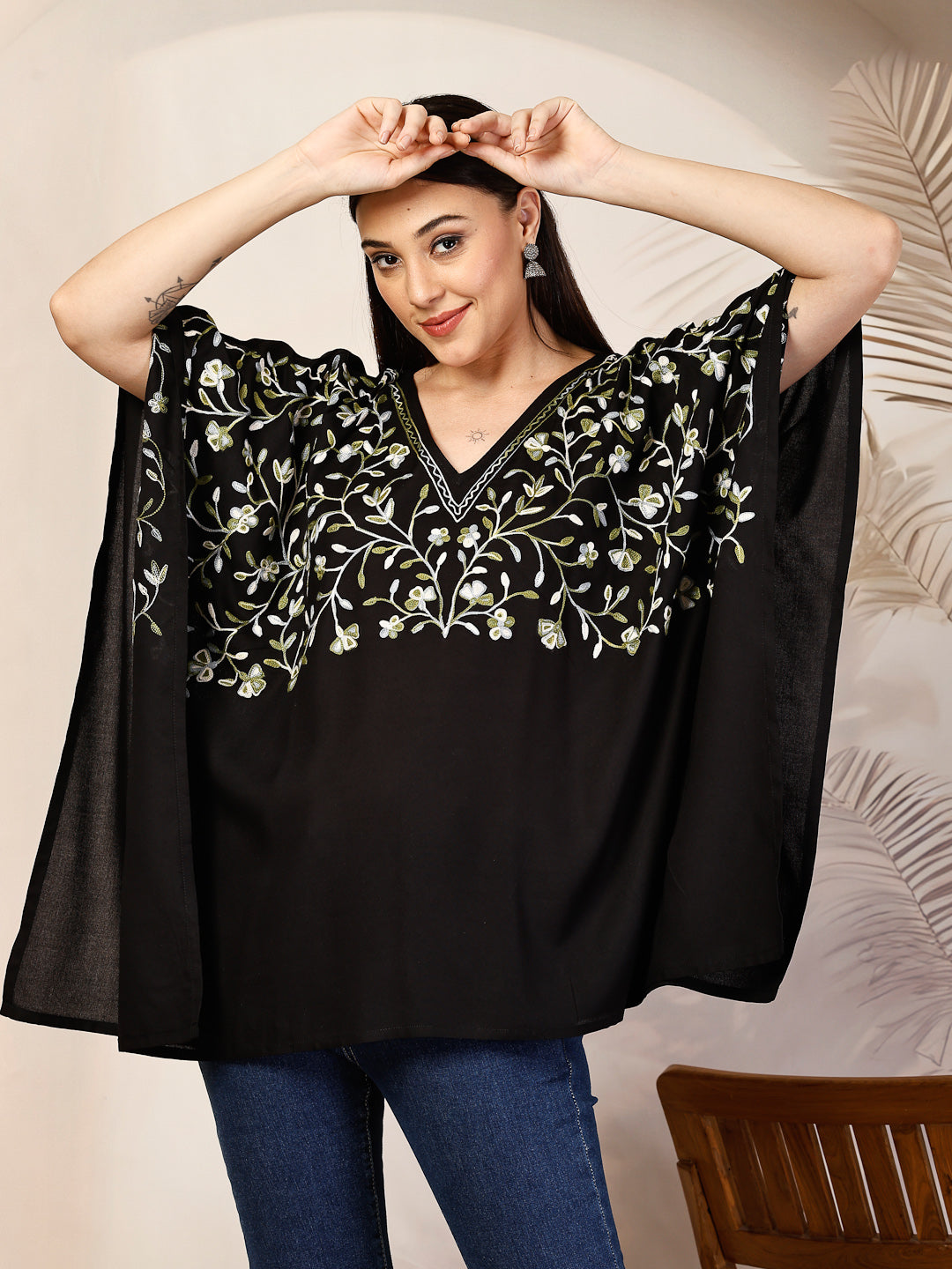 Embrace timeless elegance with our stunning Kashmiri Embroidered Kaftan, a perfect blend of tradition and contemporary style. This free-size kaftan is designed to flatter all body types, offering a comfortable yet stylish fit for every occasion.Crafted from luxurious, breathable fabric, the kaftan is adorned with intricate Kashmiri embroidery—a hallmark of exquisite craftsmanship. The hand-embroidered motifs, featuring traditional paisley, floral patterns, and fine needlework, showcase the rich cultural heritage of Kashmir. Delicate threads of vibrant colors bring the intricate designs to life, making this piece a true statement of art.Whether you're lounging at home, attending a casual gathering, or stepping out for a festive occasion, this kaftan provides effortless style with its flowy silhouette and detailed artistry. Pair it with minimal accessories for a chic, ethnic look.