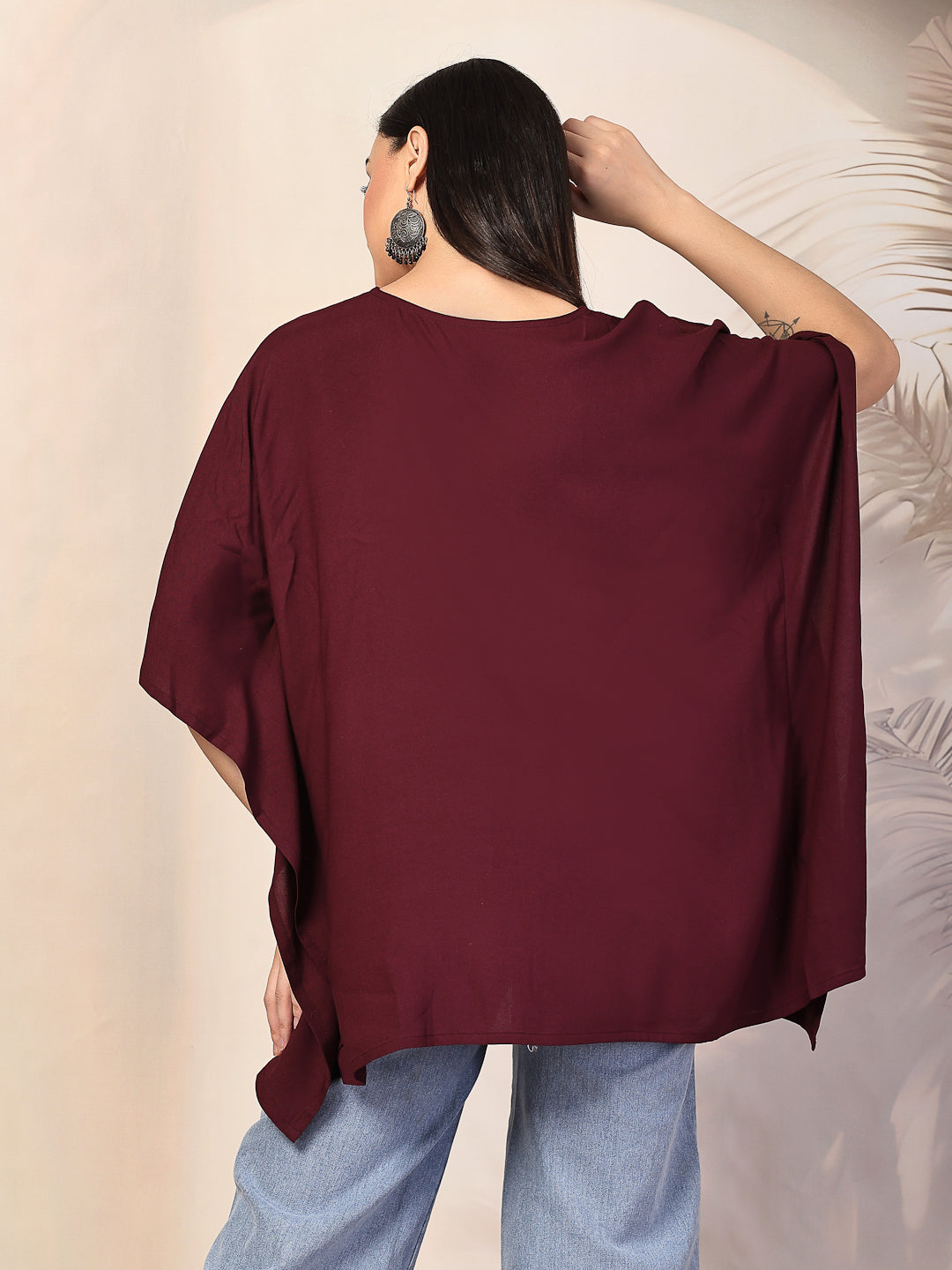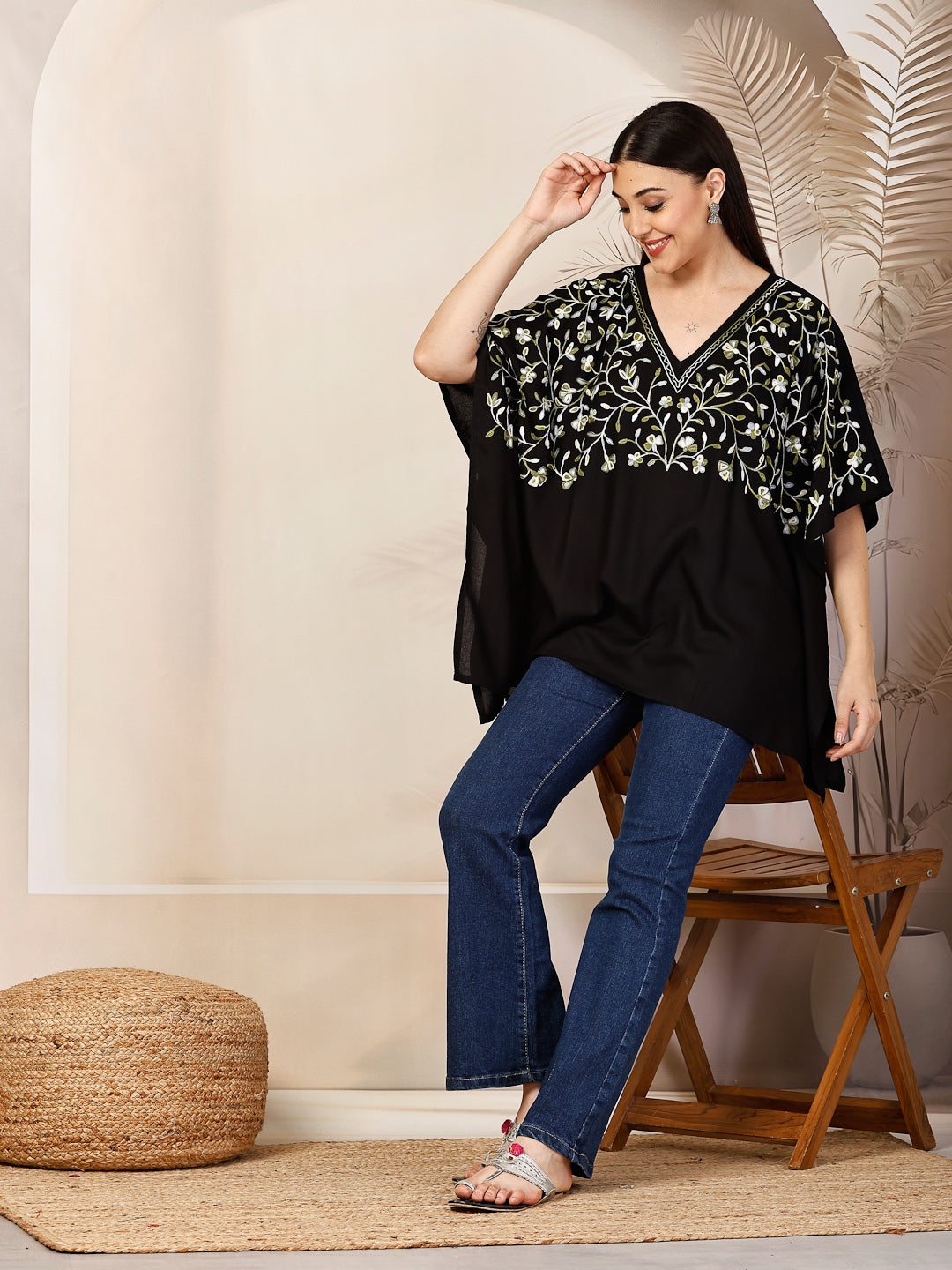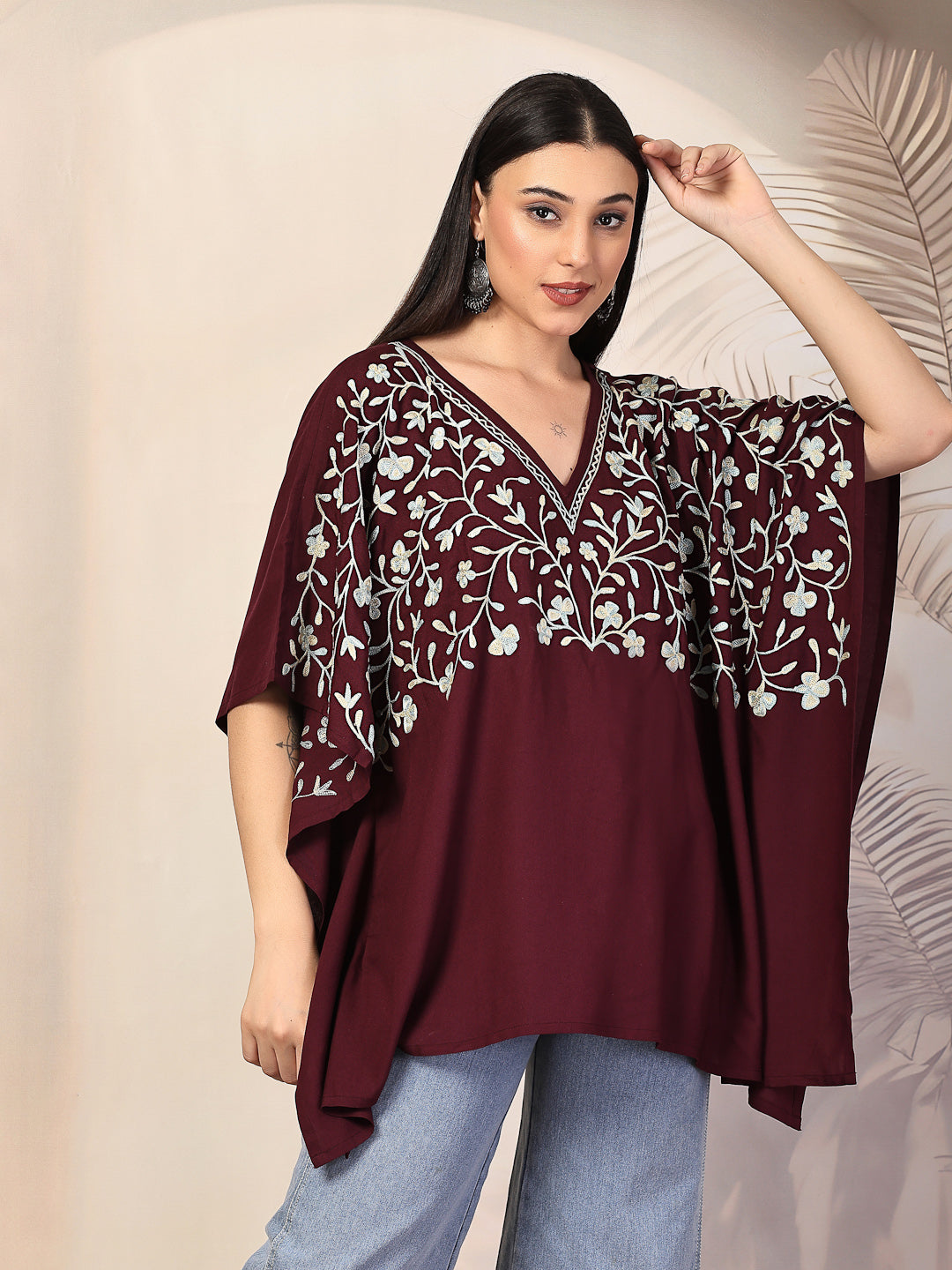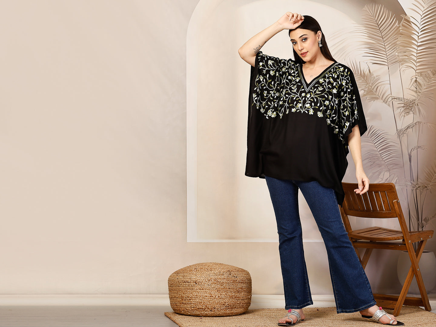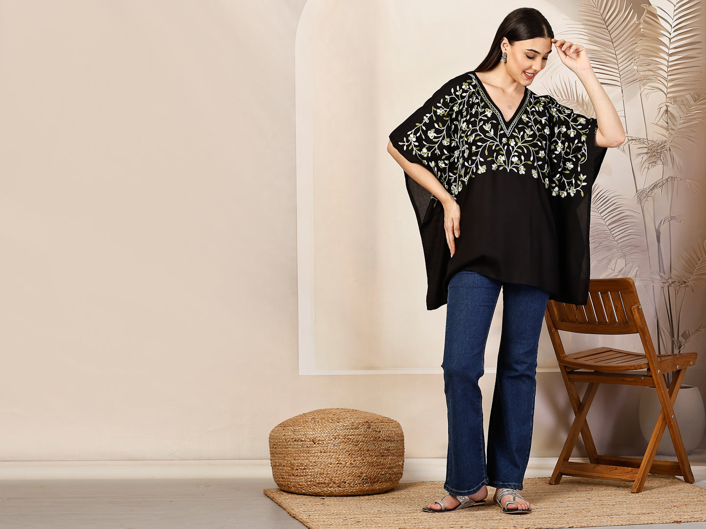 QAZMI Sheen V-Neck Flared Sleeves Kashmiri Aari Work Kaftan Kurti