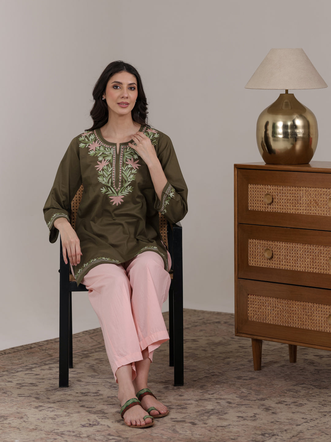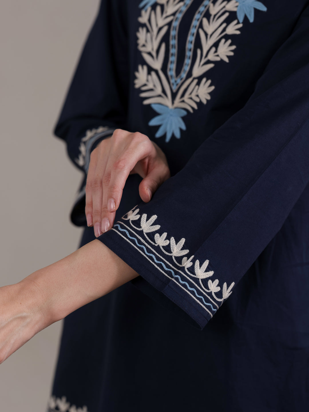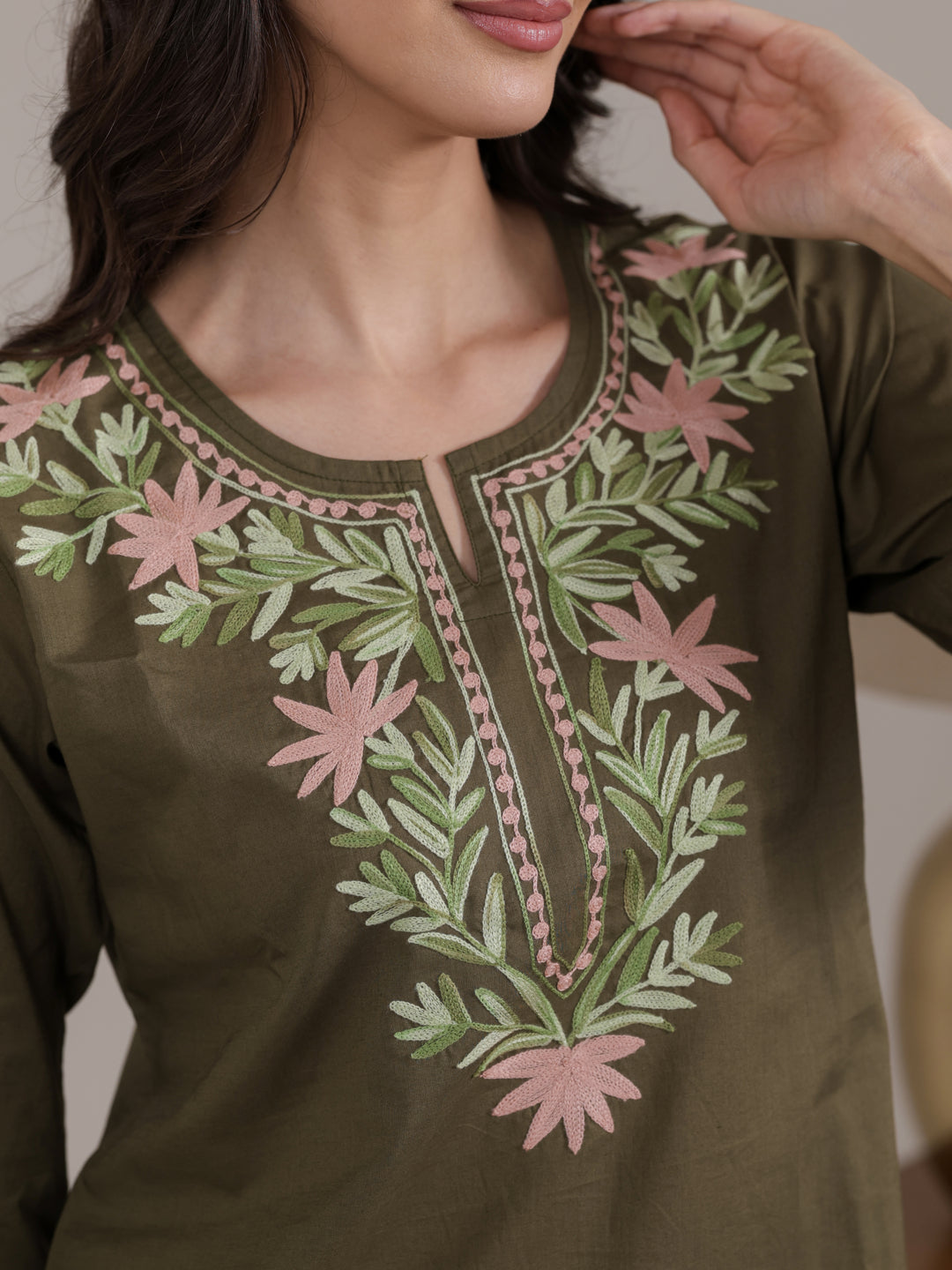 Embroidery Detail: Elegant Kashmiri Aari Work Kurta with intricate traditional embroidery for a refined ethnic and smart casual look.