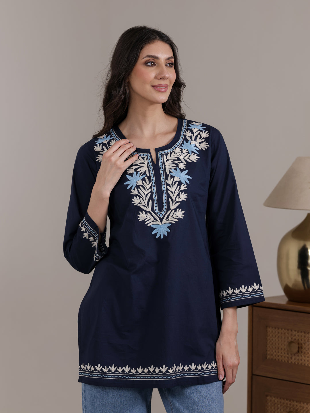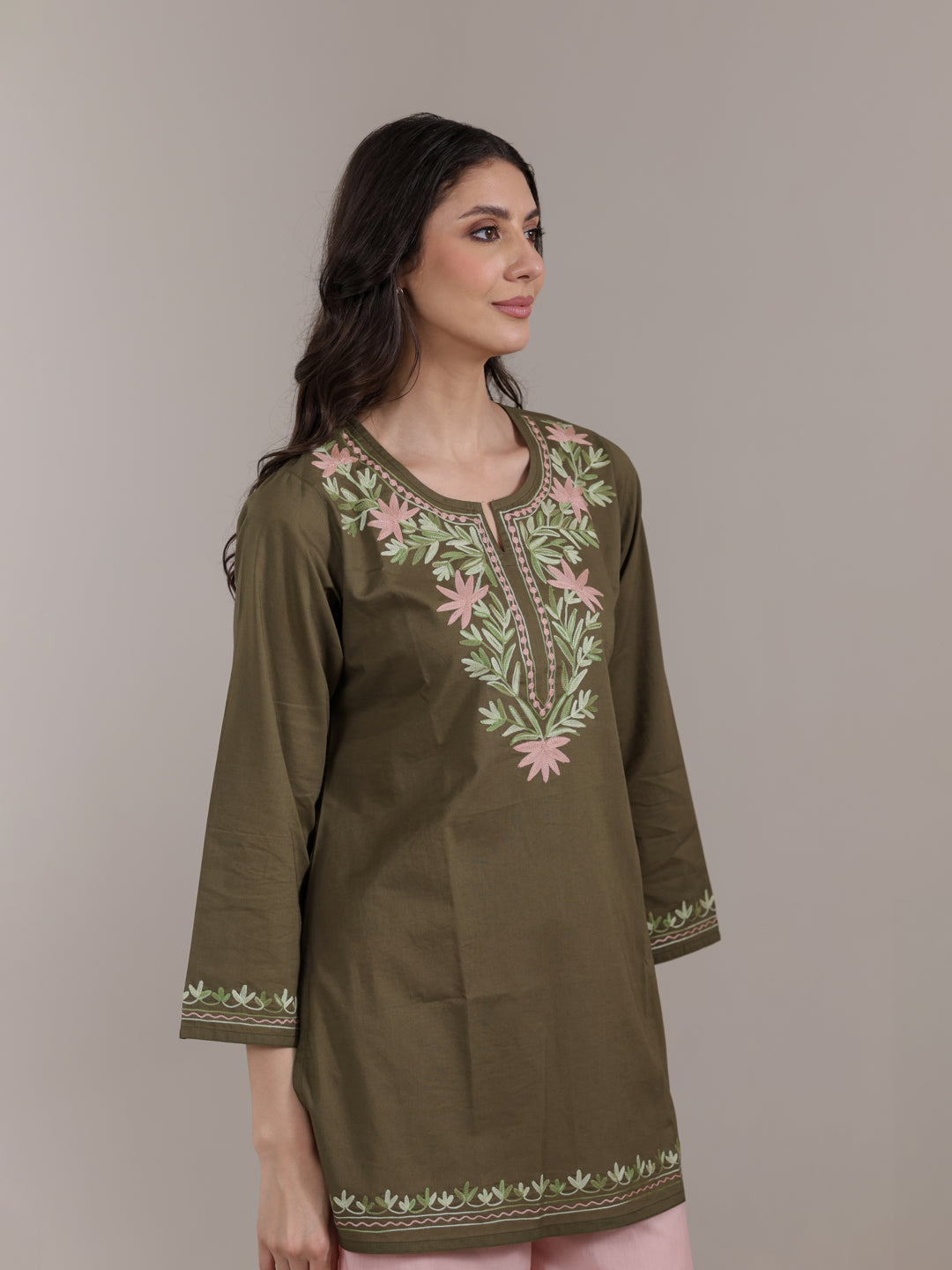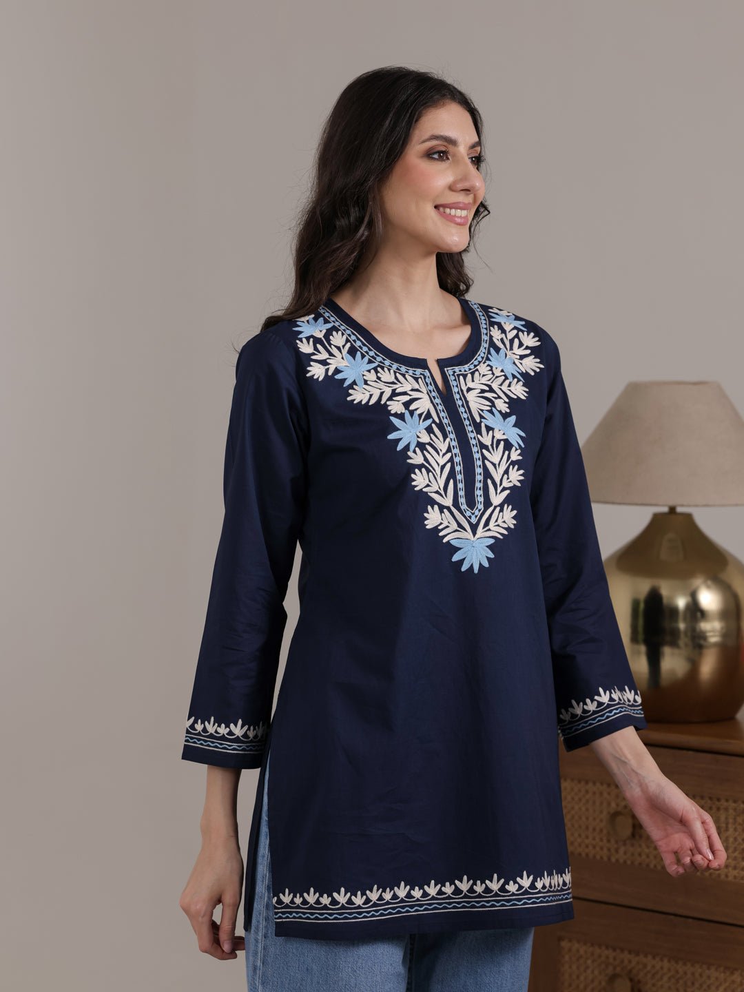 Stay stylish and comfortable with this Qazmi women’s pure cotton short kurta, designed for effortless summer wear. Featuring elegant Kashmiri Aari embroidery, a keyhole neck, full sleeves, and a straight fit, it offers a flattering look. Pair it with jeans, trousers, or ethnic pants for daily wear, office, or casual outings