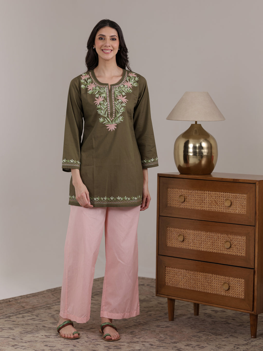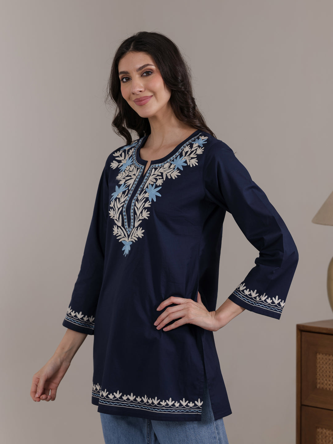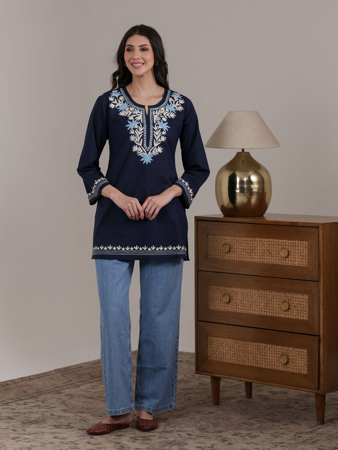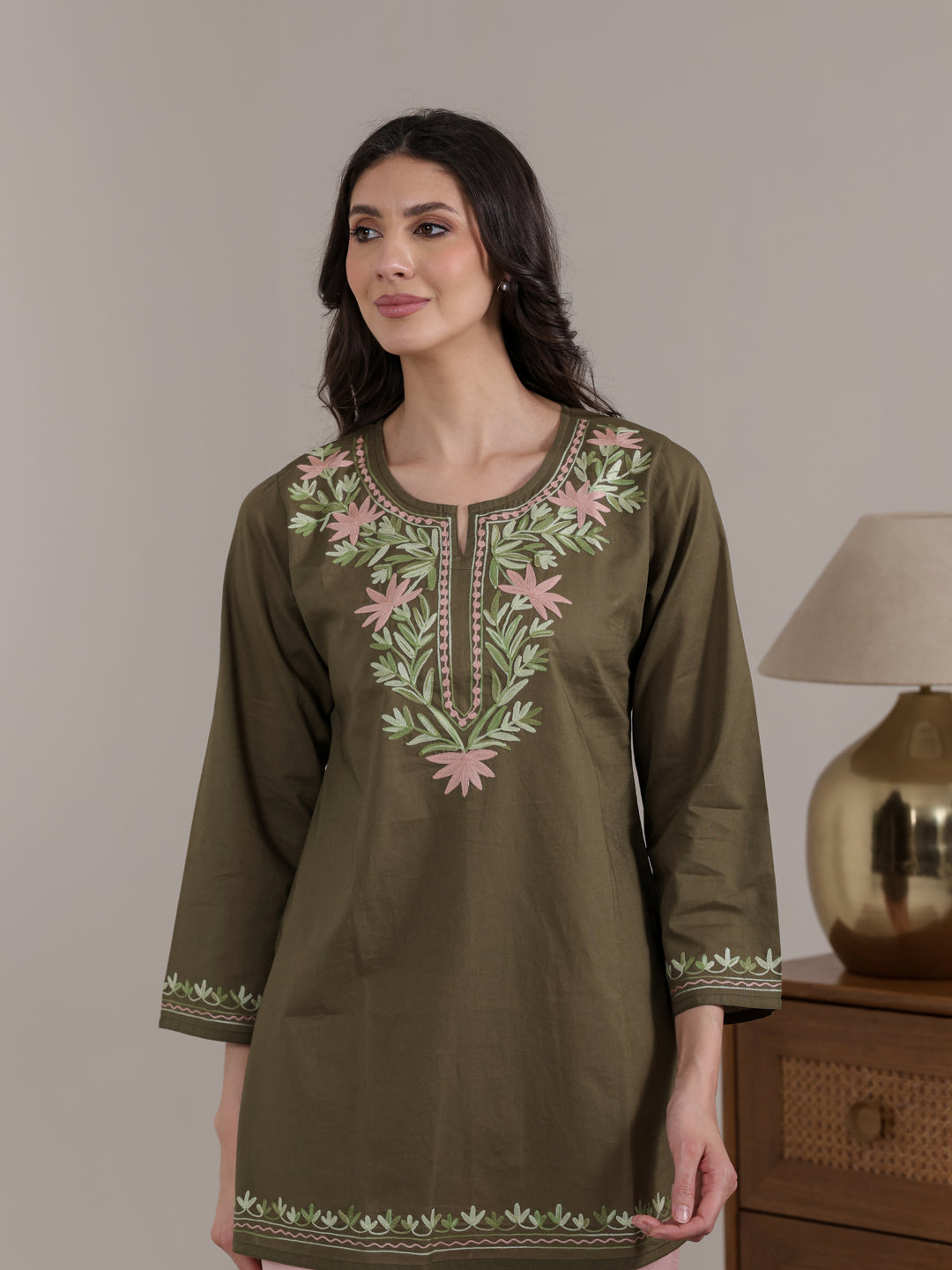 Stay stylish and comfortable with this Qazmi women’s pure cotton short kurta, designed for effortless summer wear. Featuring elegant Kashmiri Aari embroidery, a keyhole neck, full sleeves, and a straight fit, it offers a flattering look. Pair it with jeans, trousers, or ethnic pants for daily wear, office, or casual outings