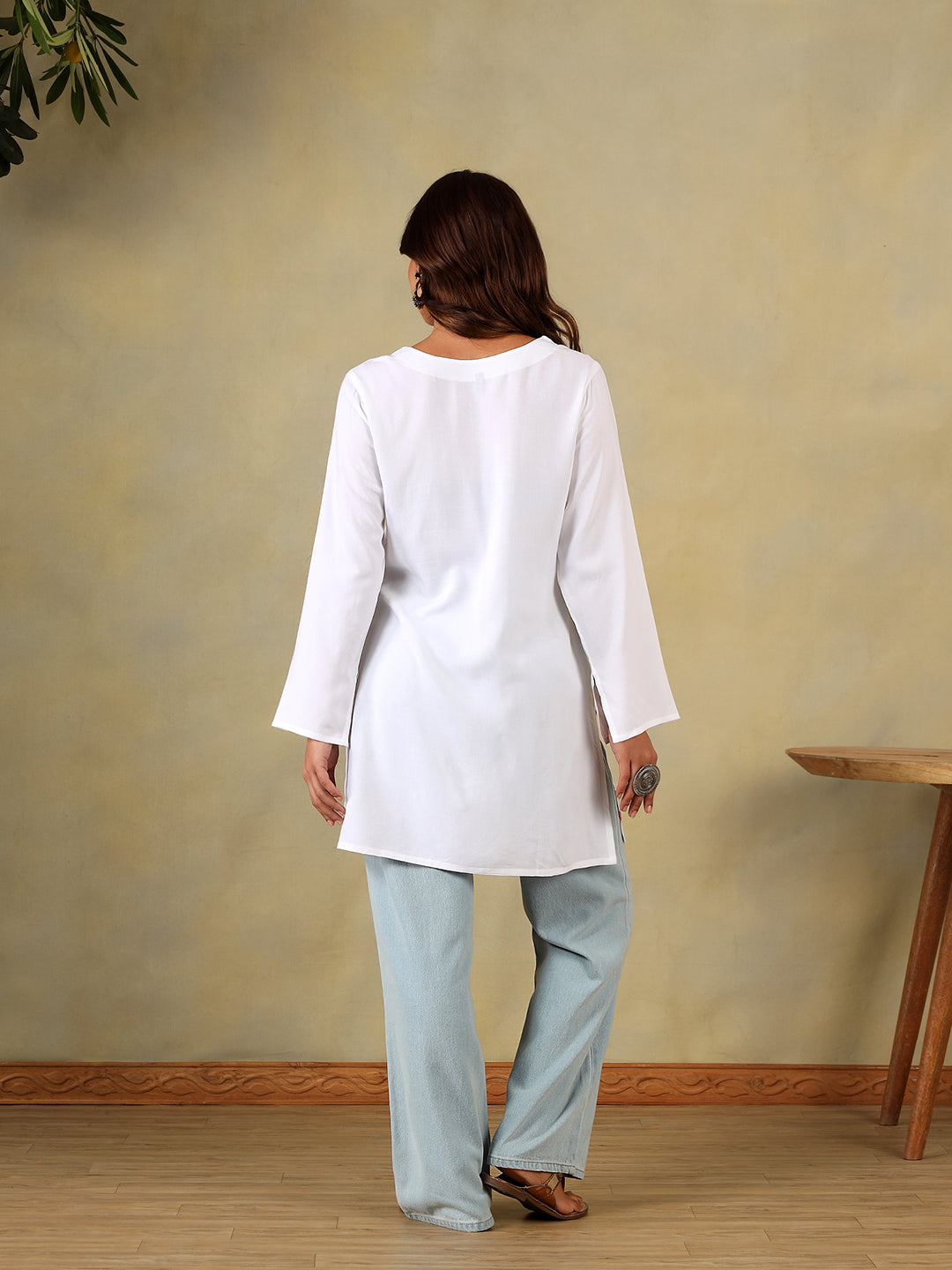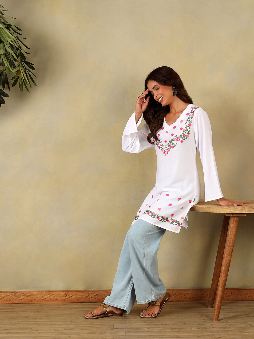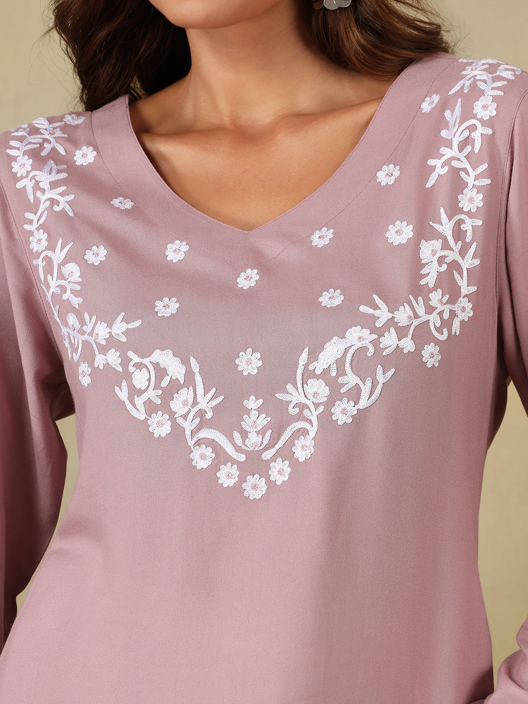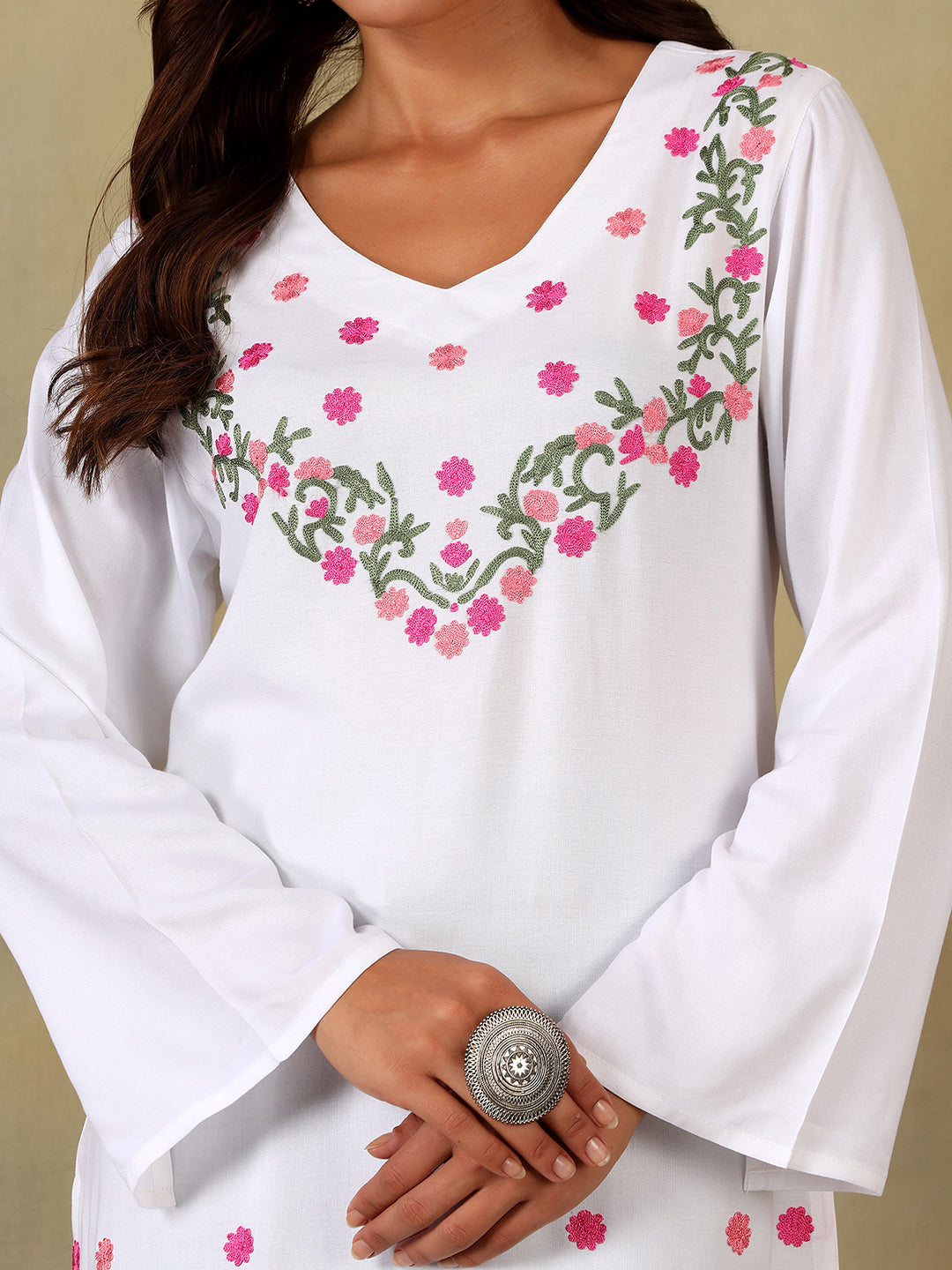 Qazmi Women's Aari Embroidered Viscose Rayon Full Sleeves Straight Kurti