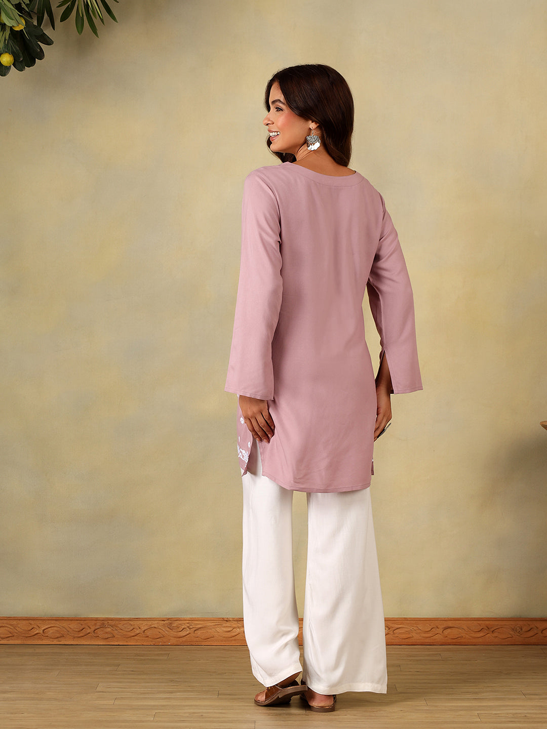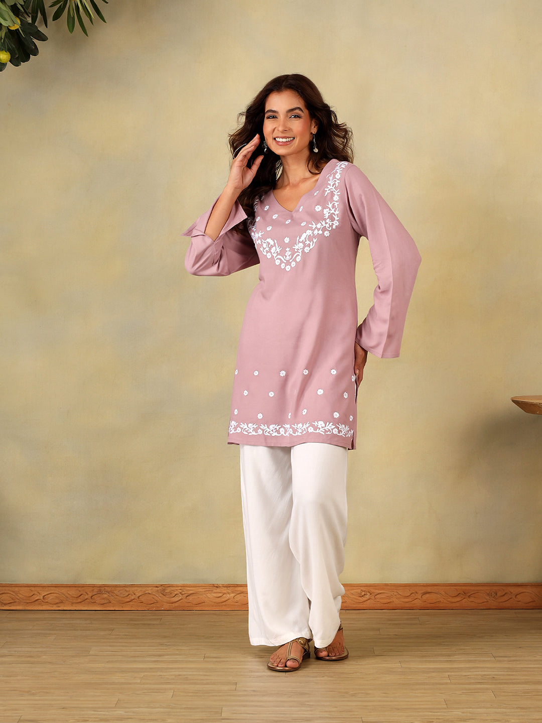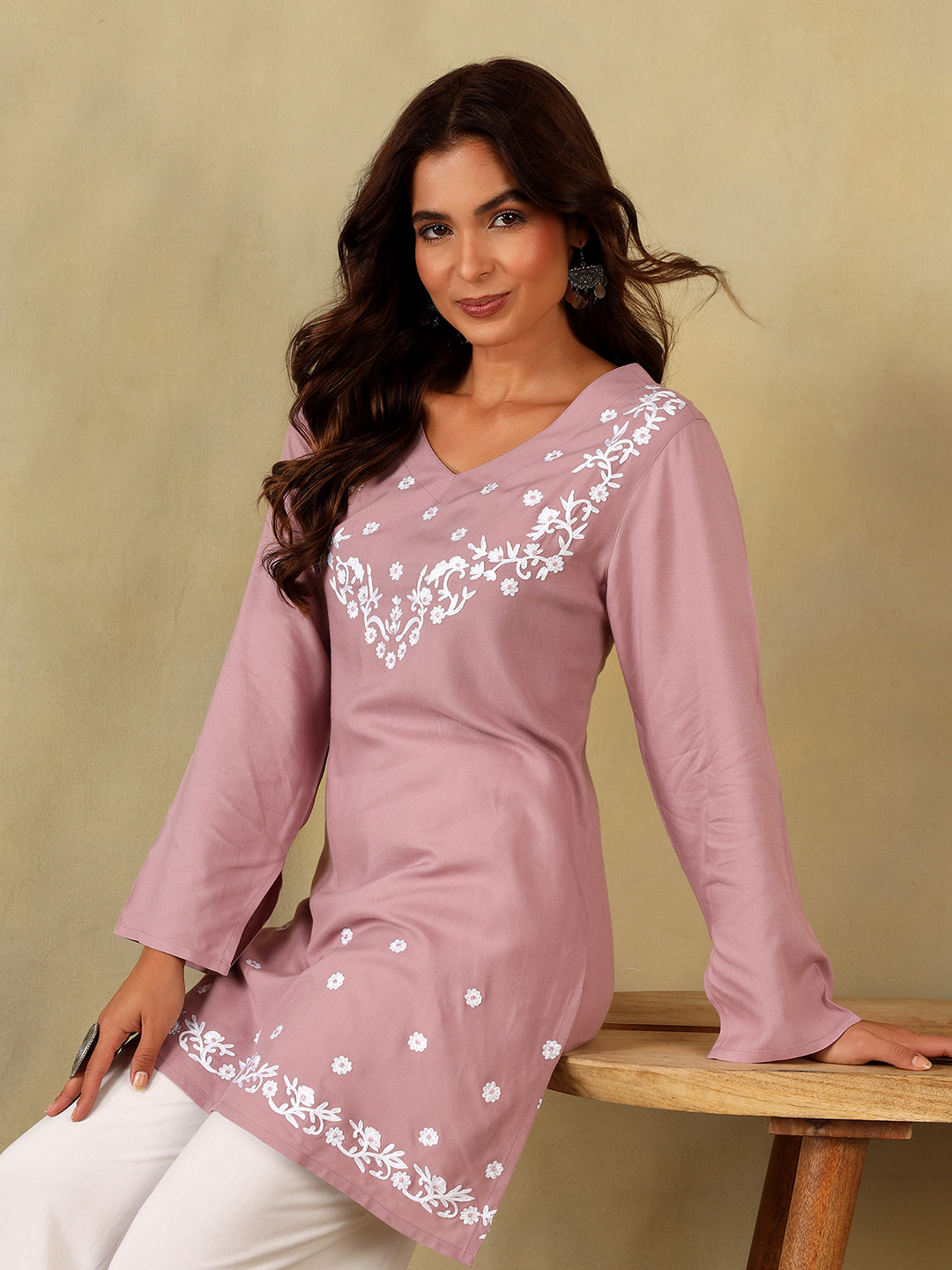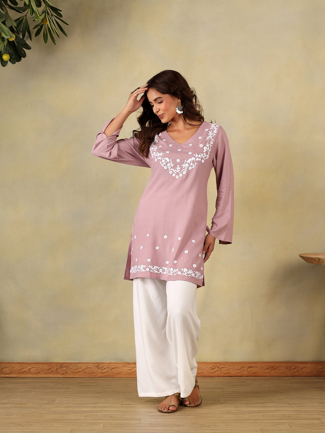 Qazmi Women's Aari Embroidered Viscose Rayon Full Sleeves Straight Kurti