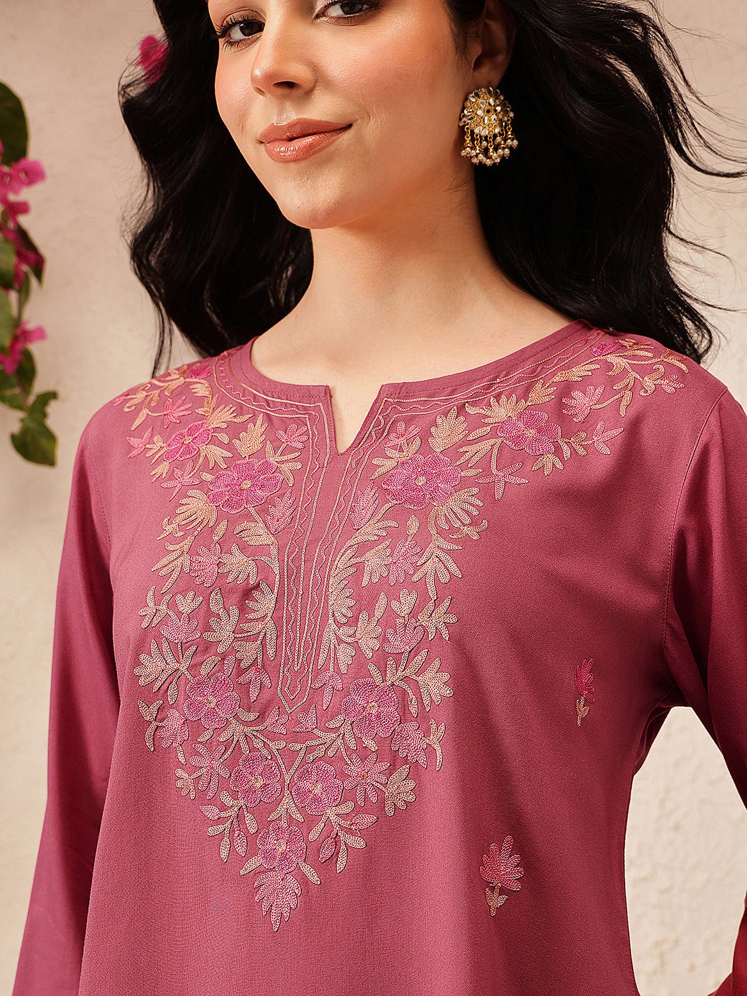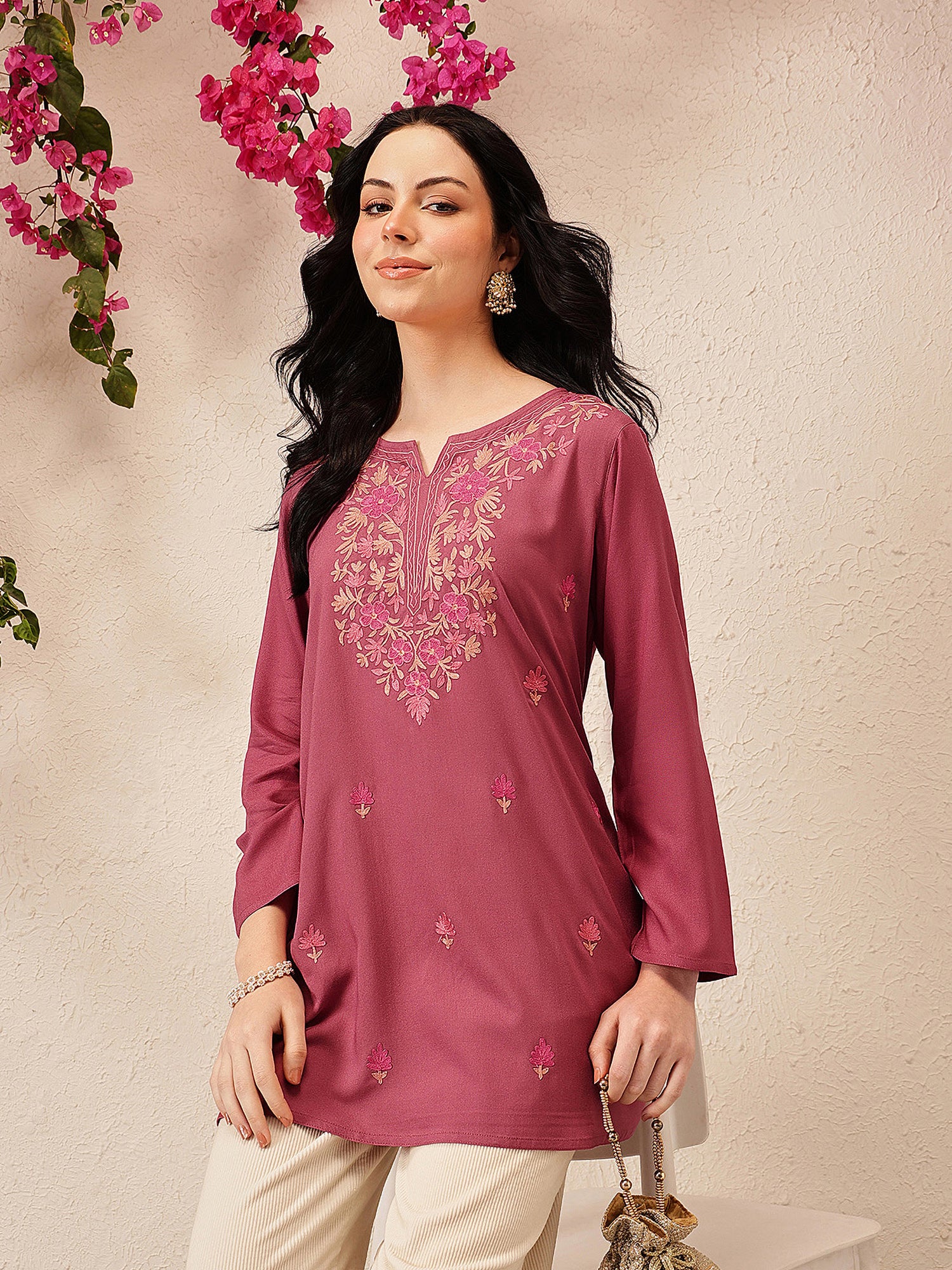 Qazmi Kashmiri Embroidered Kurti Elevate your wardrobe with the timeless elegance of the Qazmi Kashmiri Flared Kurti. This stunning piece features a graceful Keyhole neck that enhances its sophisticated appeal. With a front length of 30 inches, it offers a perfect fit that flatters all body types. Adorned with intricate Aari embroidery, the kurti showcases the skilled craftsmanship of Kashmiri artisans. The delicate work, done with Cotton thread, adds texture and depth to the kurti, making it a true work of art. Whether you're dressing up for a special occasion or seeking an everyday ethnic touch, this kurti is designed to bring both comfort and style to your wardrobe