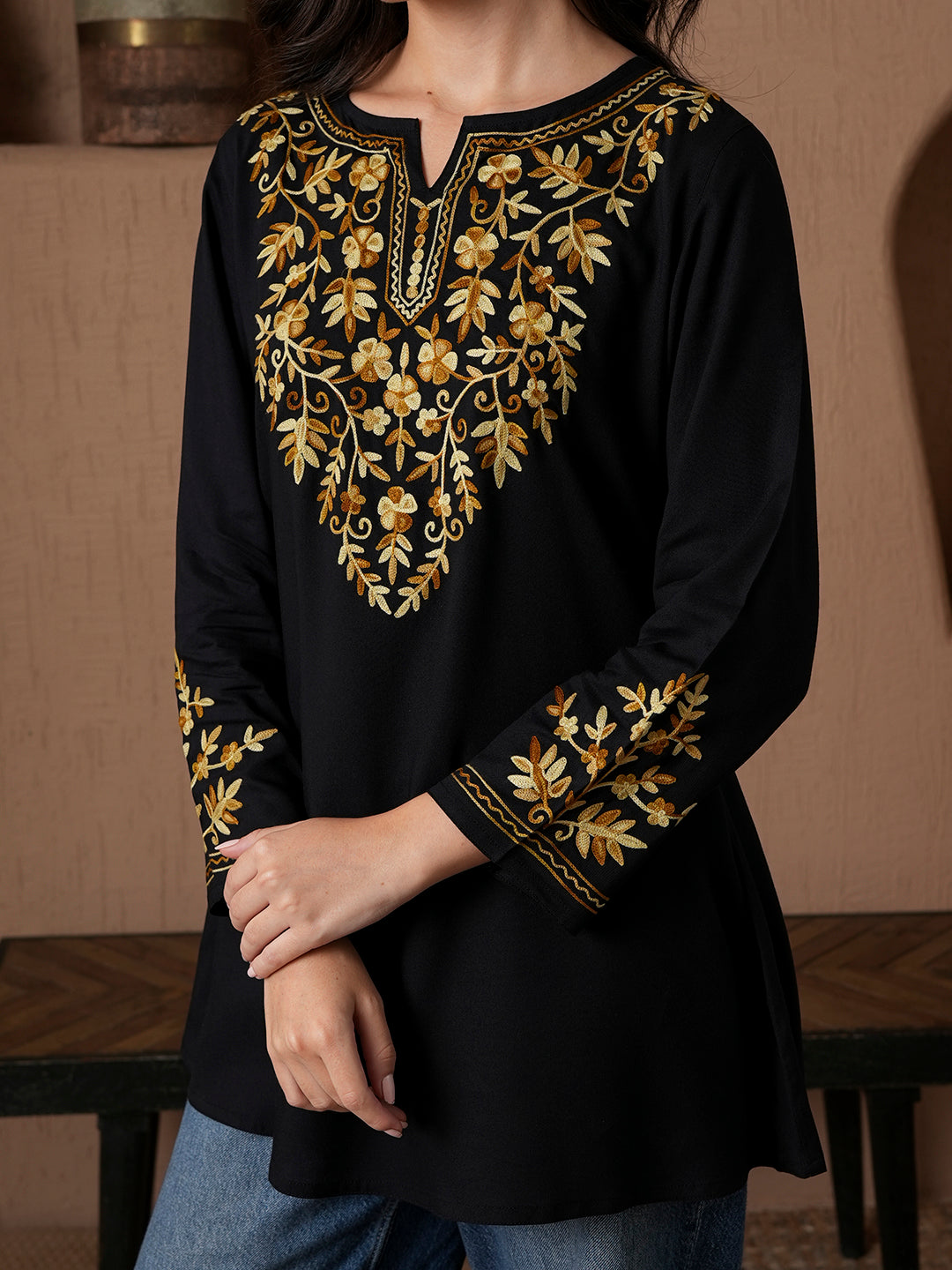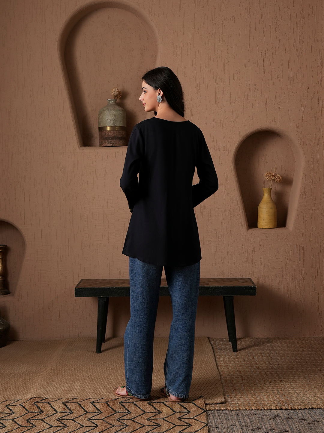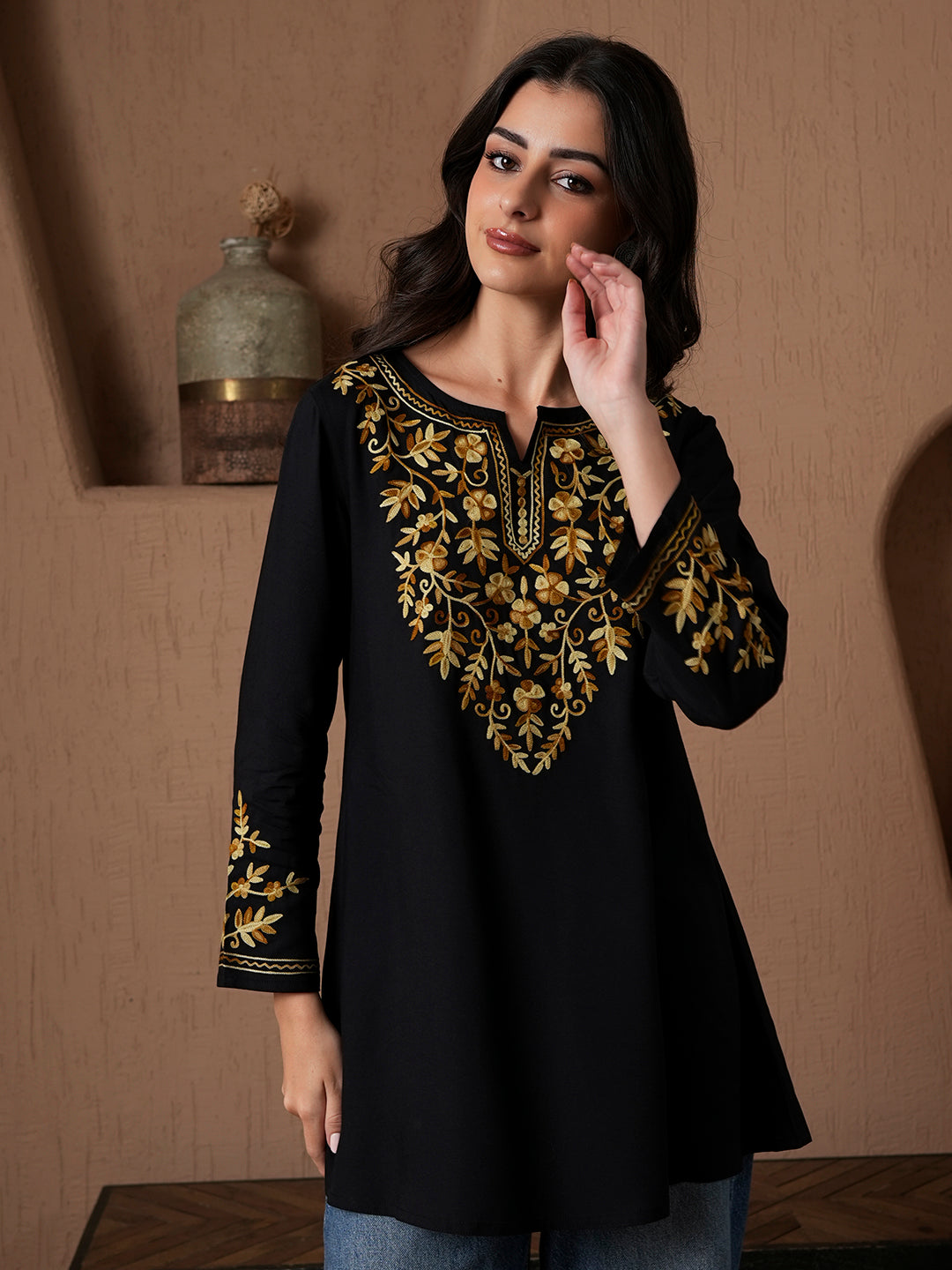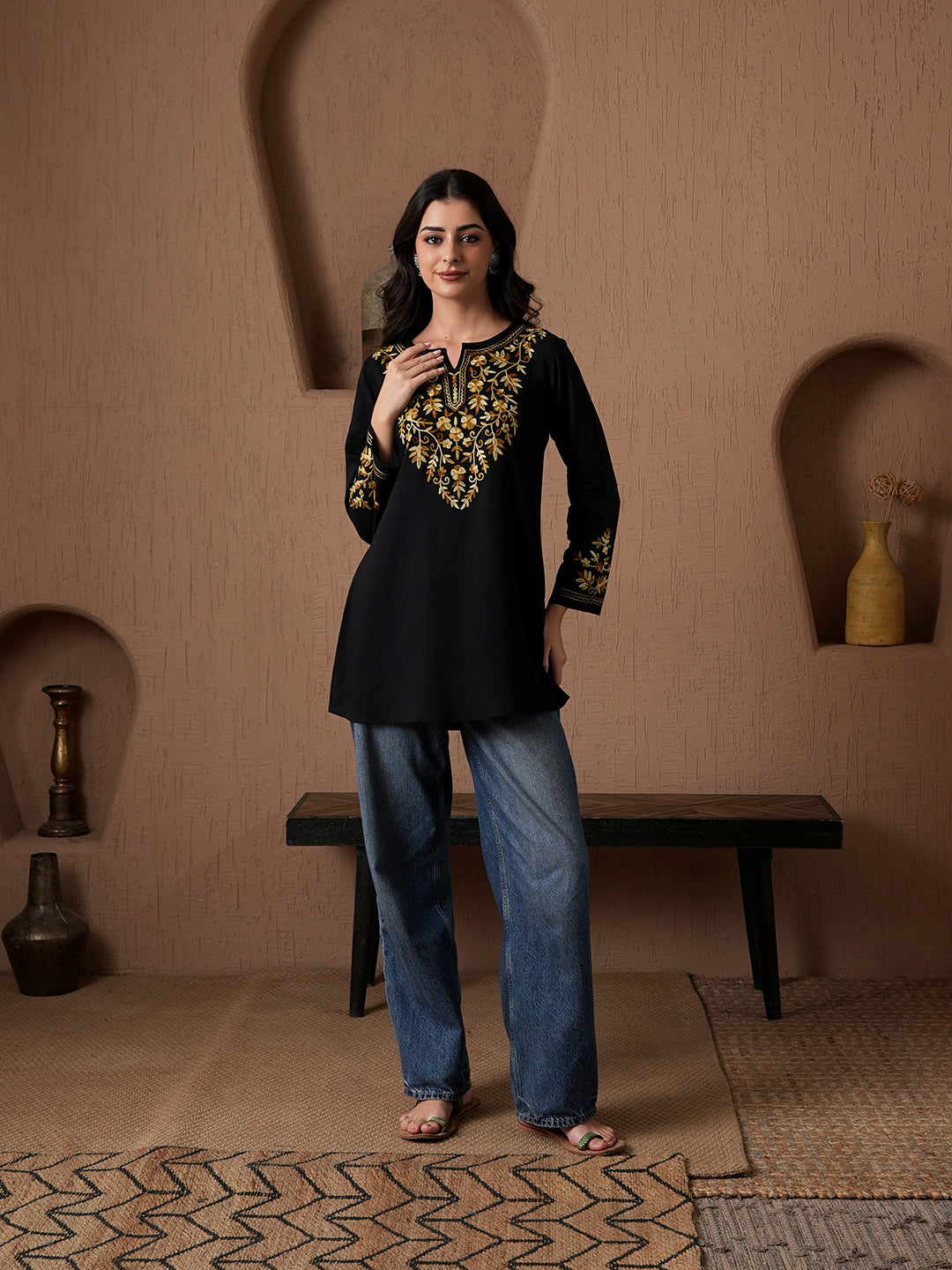 Qazmi Women's Kashmiri A-Line Full Sleeves Viscose Rayon Black Flared Short Kurti