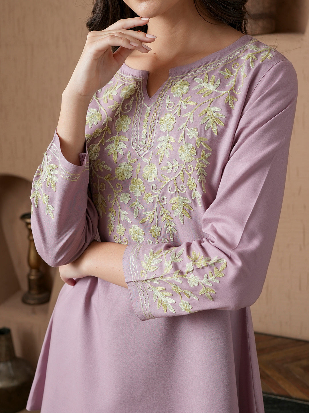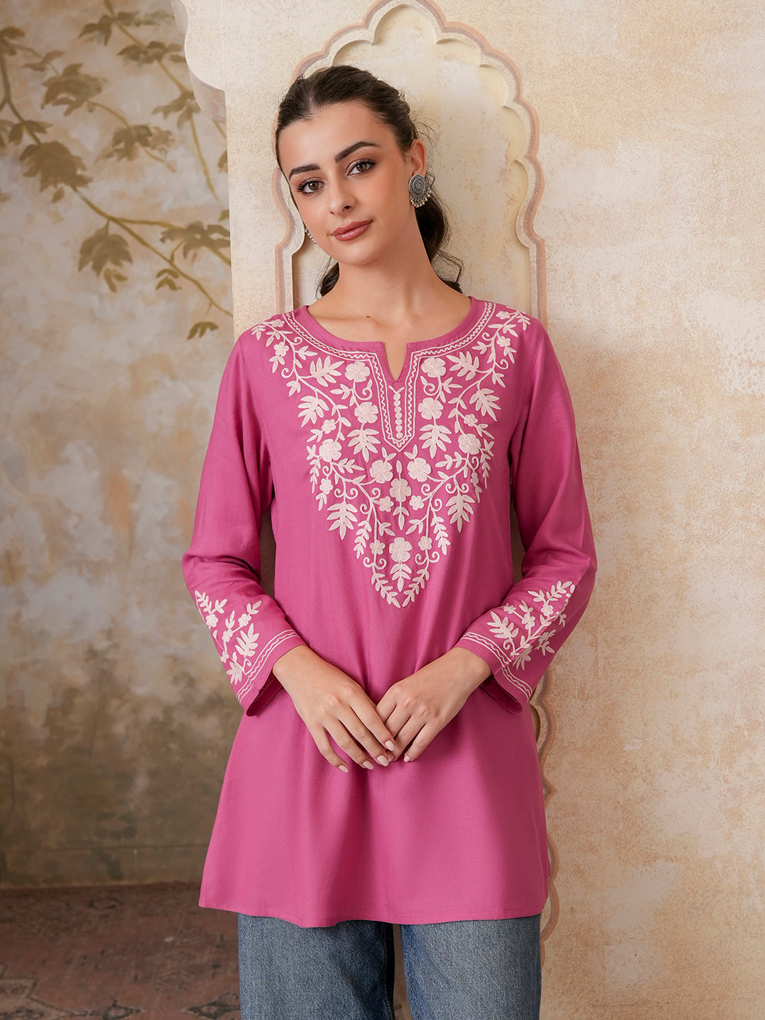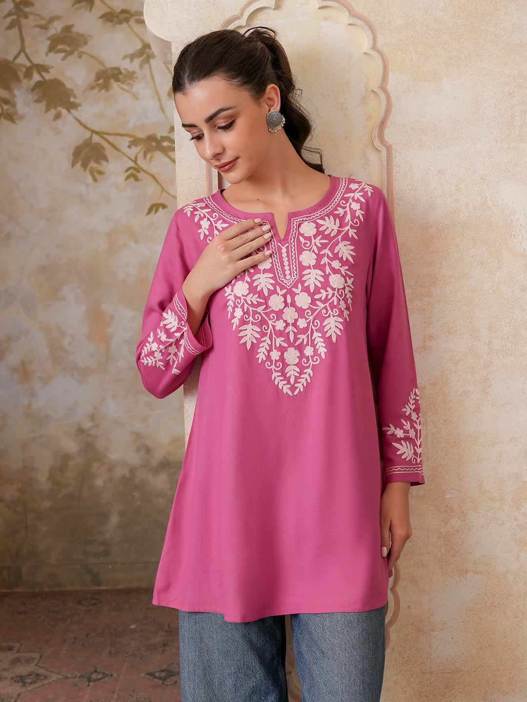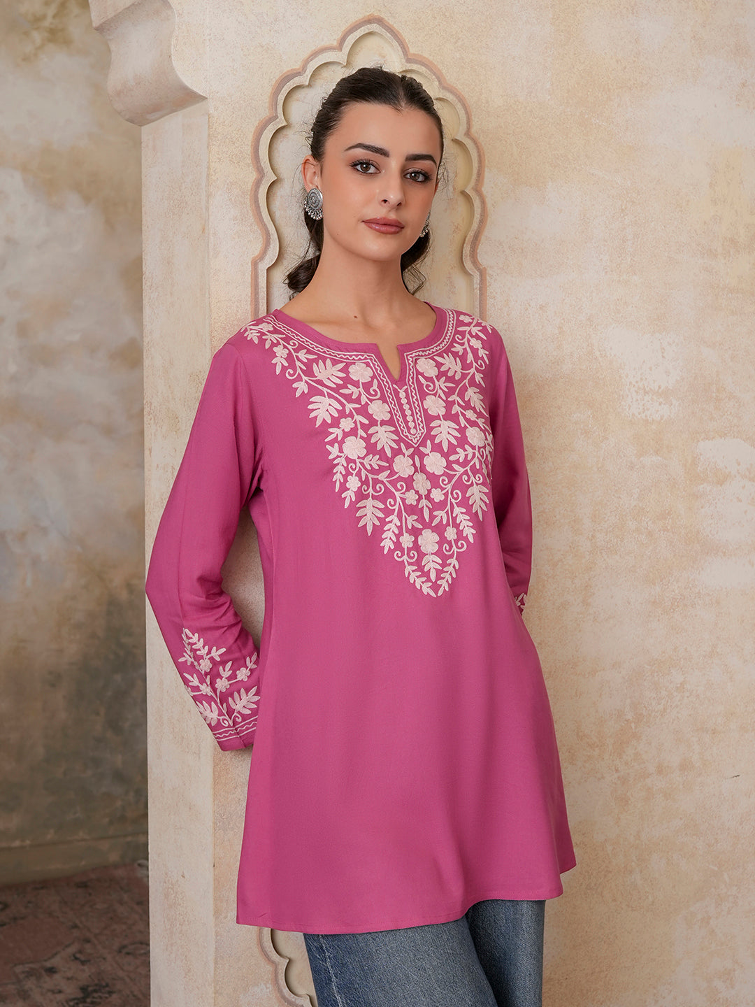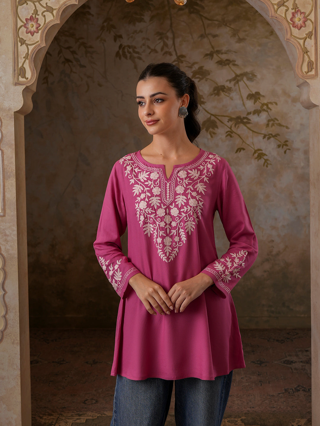 Qazmi Women's Kashmiri A-Line Full Sleeves Viscose Rayon Black Flared Short Kurti