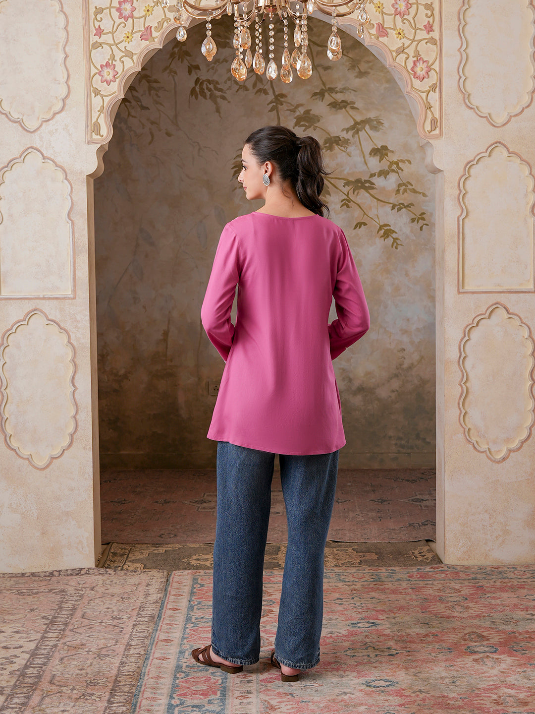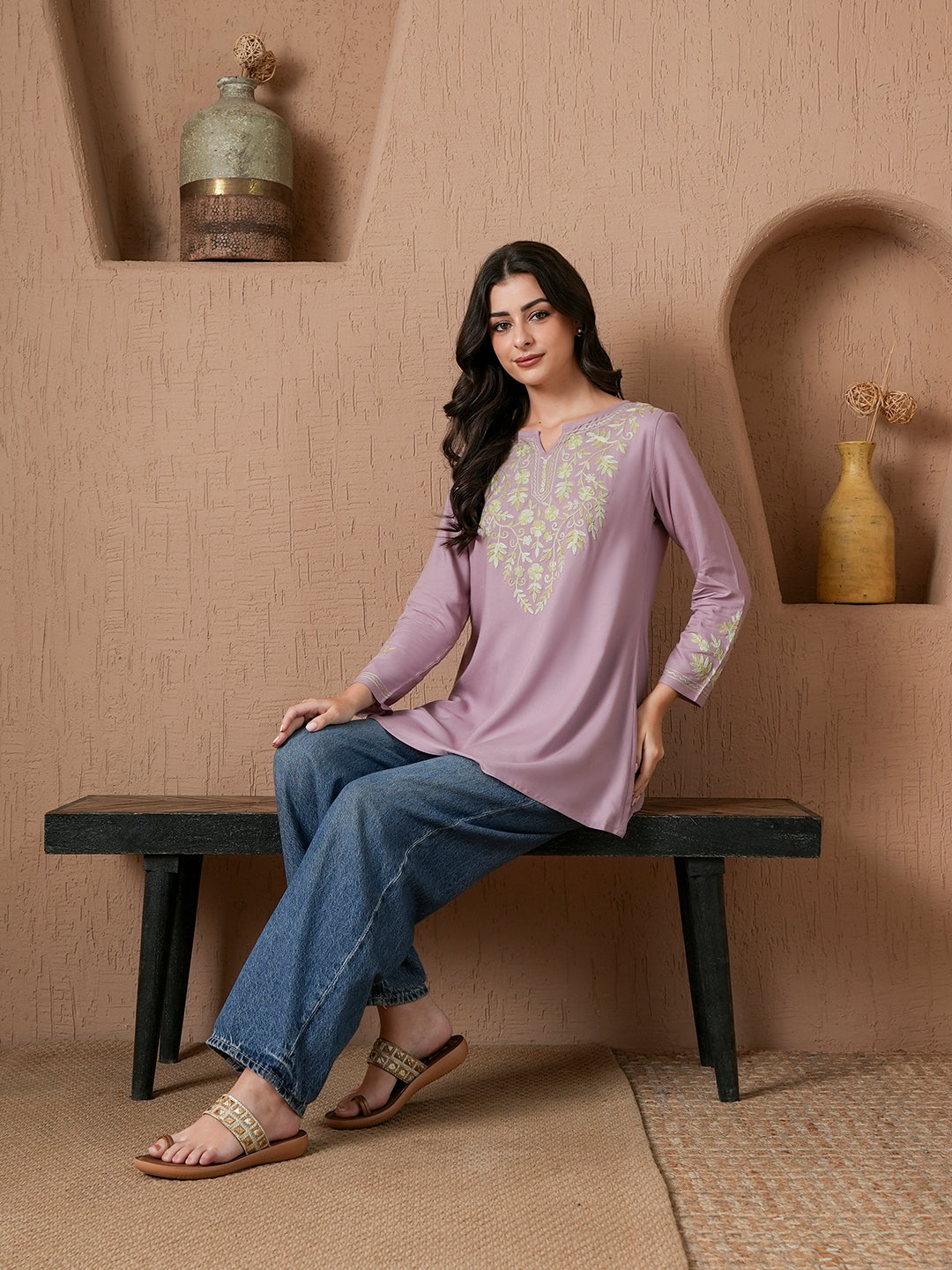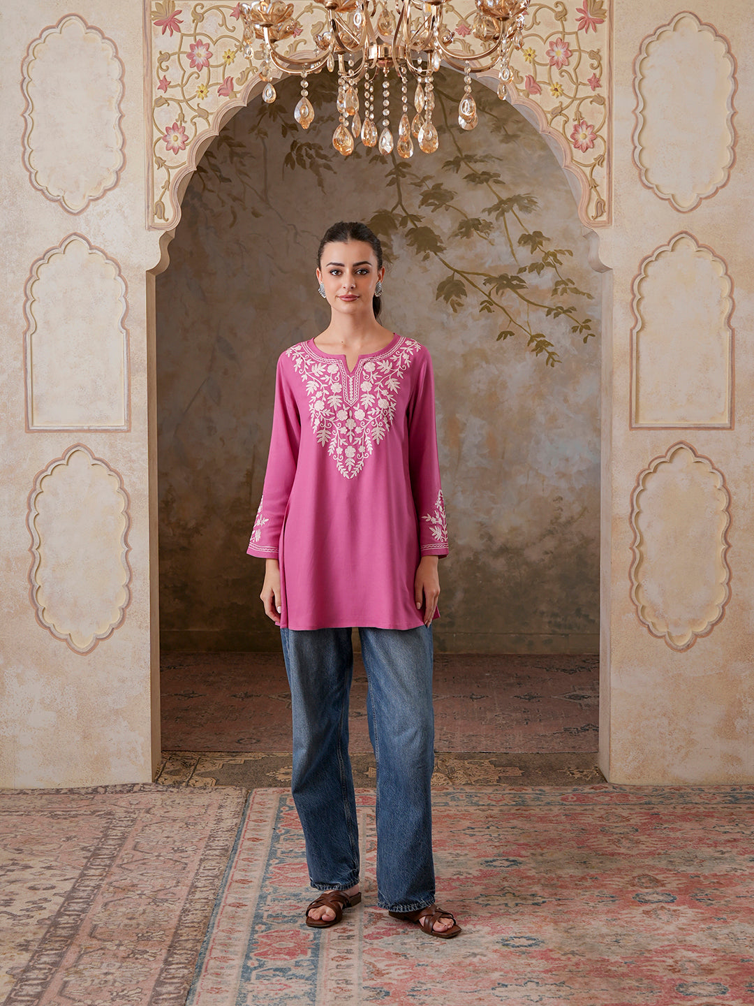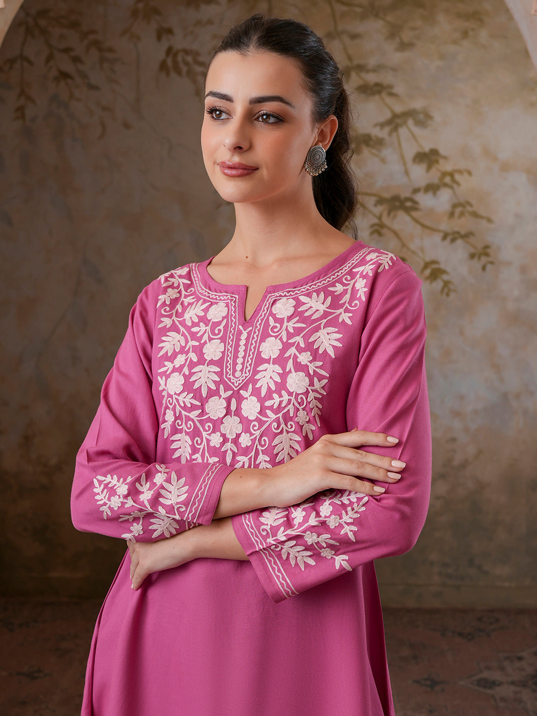 Qazmi Women's Kashmiri A-Line Full Sleeves Viscose Rayon Black Flared Short Kurti