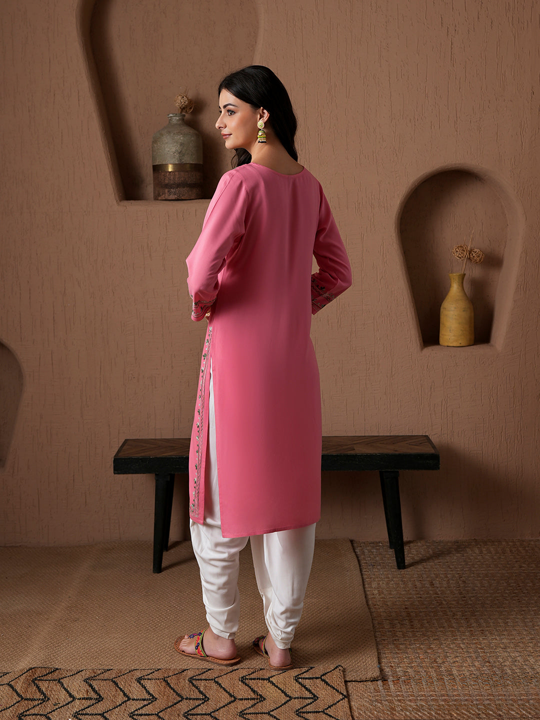 Embrace timeless elegance with this Kashmiri Aari work long kurta, crafted with intricate hand embroidery that reflects the artistry of Kashmir. Designed with a 40-inch front length, it drapes gracefully for a flattering look. Lightweight and versatile, this kurta transitions seamlessly from festive gatherings to everyday elegance. Pair it with palazzos, churidars, or straight pants for a complete ethnic charm. A perfect blend of tradition and comfort, made to elevate your wardrobe.