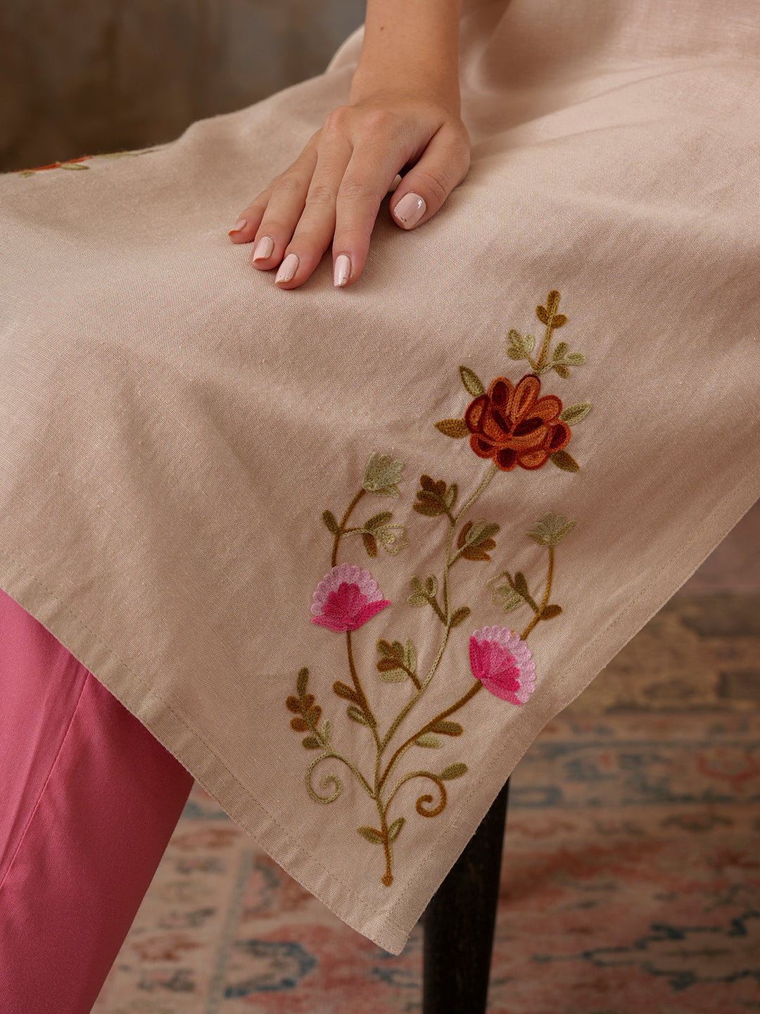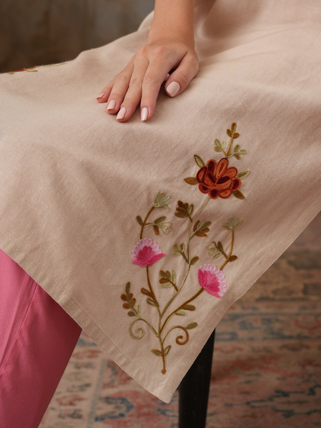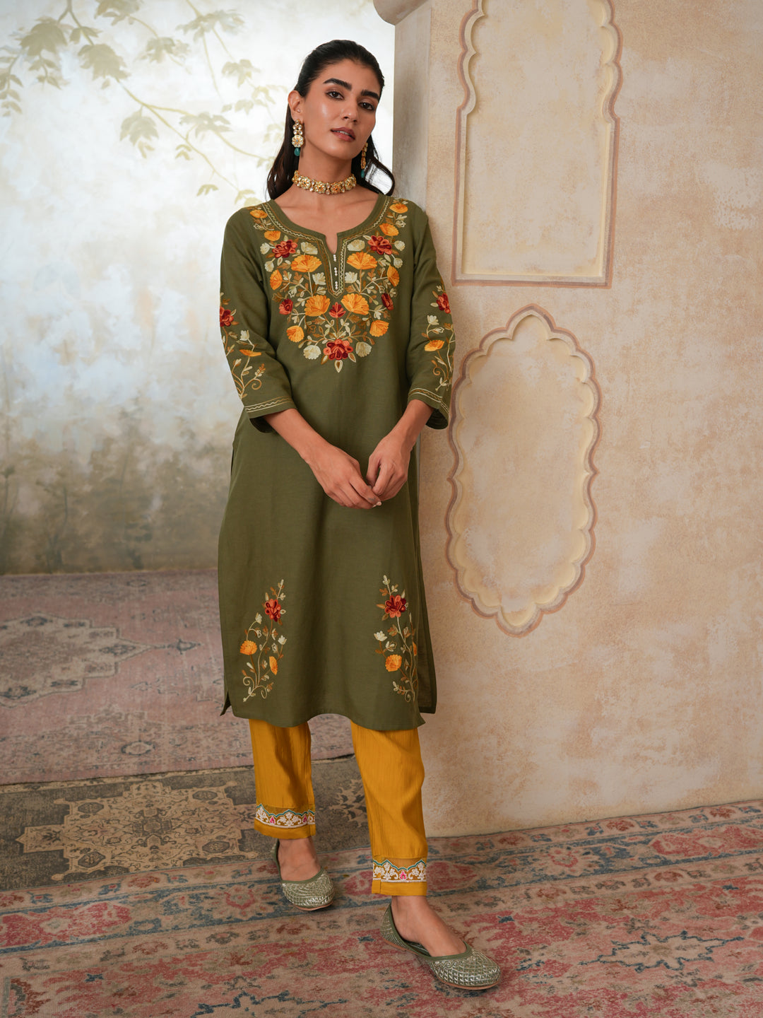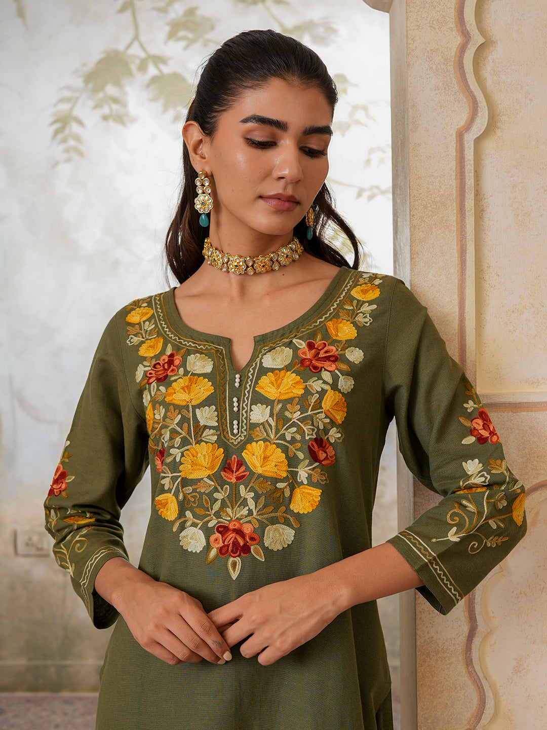 Qazmi Women's Zaynab Kashmiri Aari Work Cotton Linen Olive Green Kurta