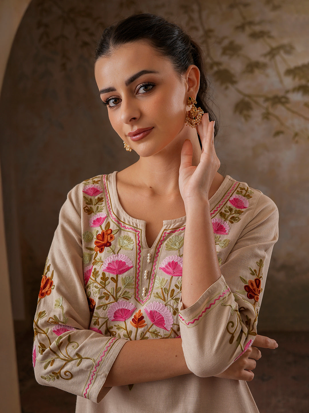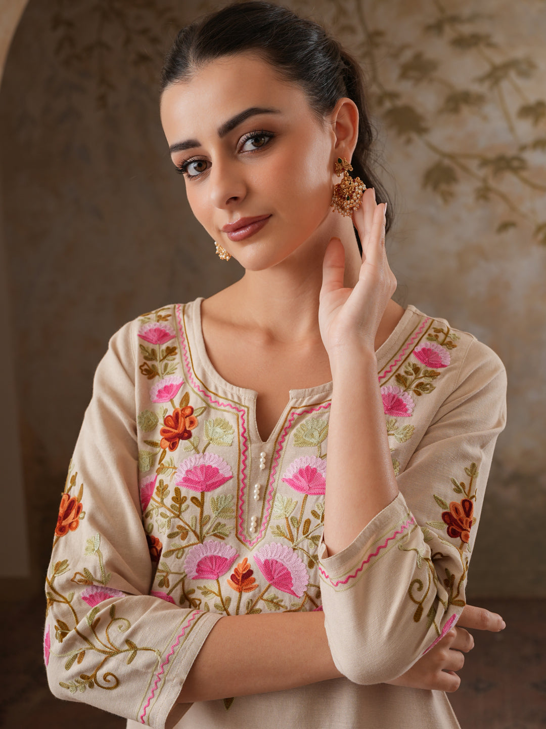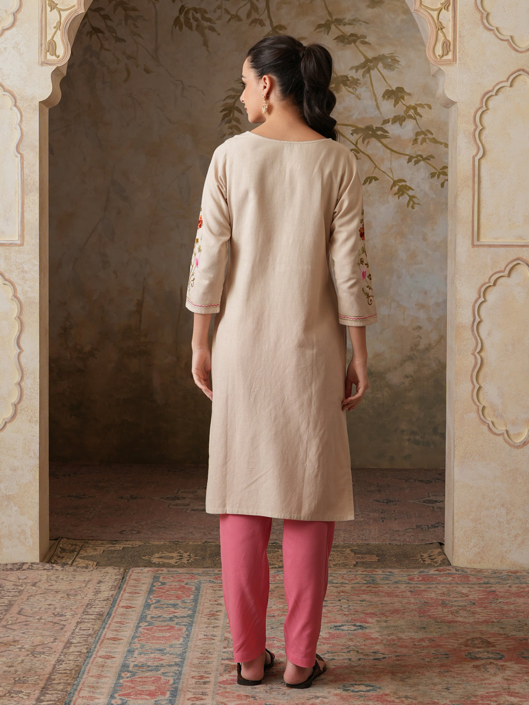 Qazmi Women's Zaynab Kashmiri Aari Work Cotton Linen Olive Green Kurta