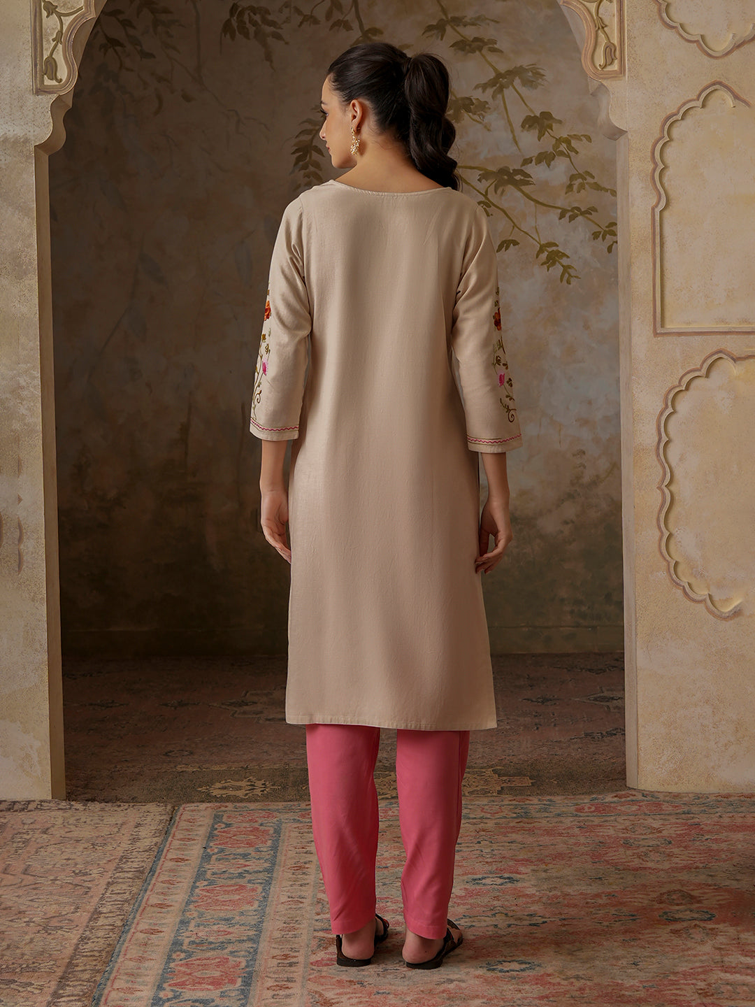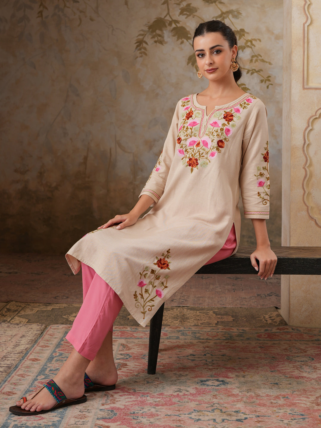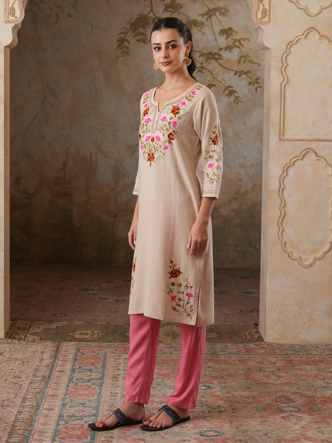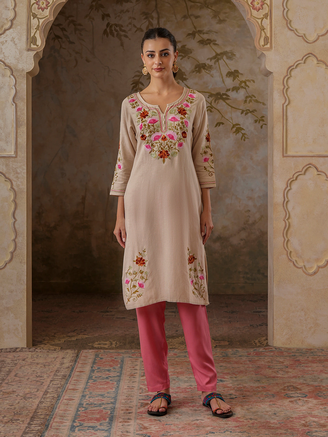 Qazmi Women's Zaynab Kashmiri Aari Work Cotton Linen Olive Green Kurta